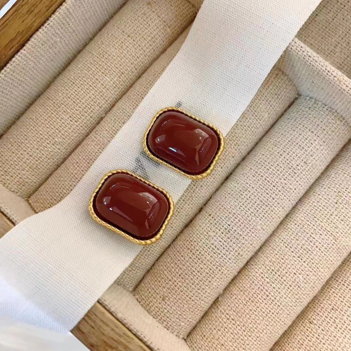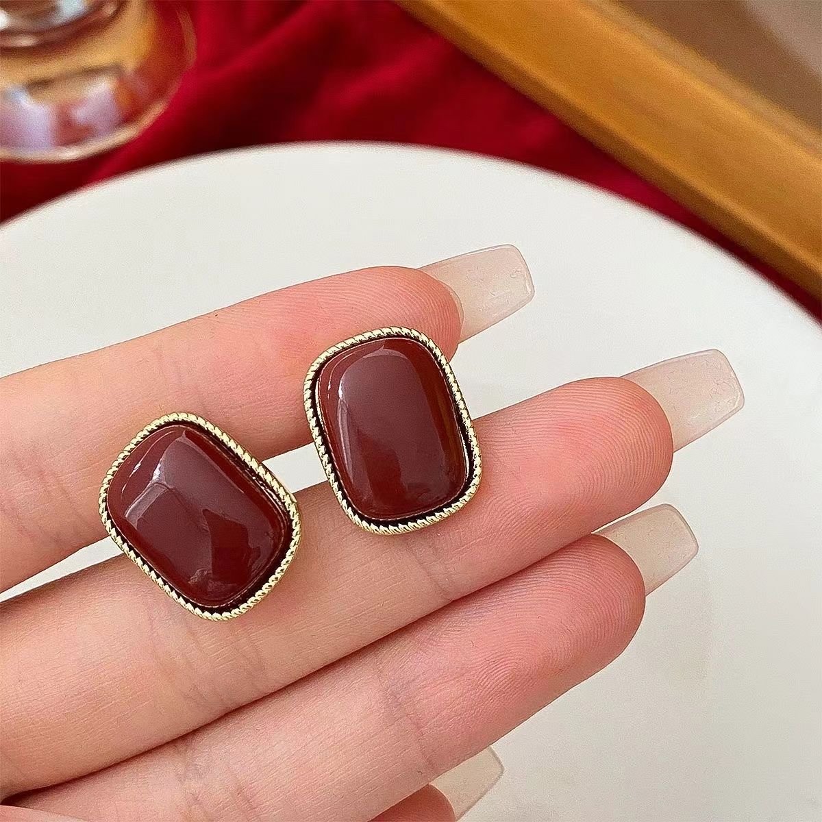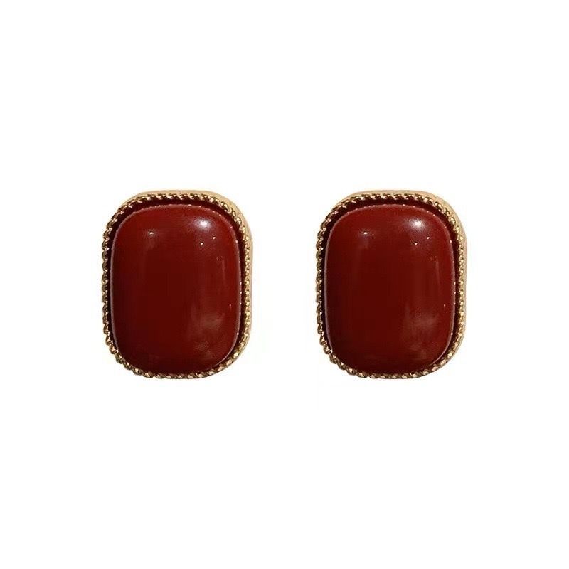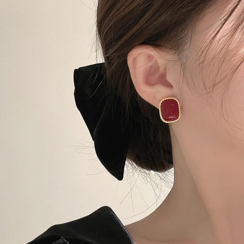 أقراط من السبائك المعدنية مربعة الشكل مرصعة باللون الأحمر