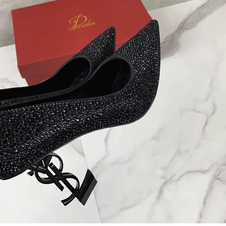 حذاء بكعب عالٍ مُثبت بأحجار الراين بالكامل بلون واحد مقدمة مدببة