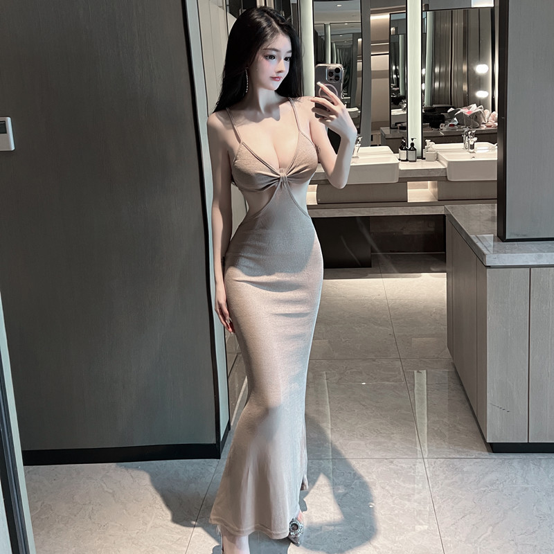 فستان طويل مثير بحمالات، مكشوف الظهر، بقصة ضيقة