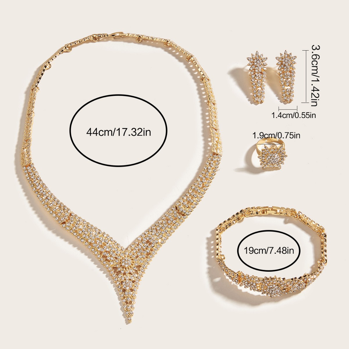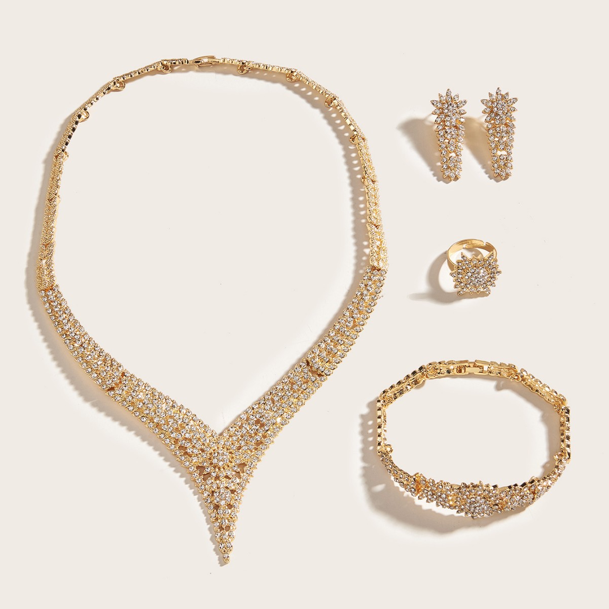 طقم مجوهرات فاخر عالي الجودة مكون من أقراط على شكل حرف V مرصعة بالكامل بأحجار الراين، وخاتم مفتوح، وقلادة مطلية بالذهب للنساء.