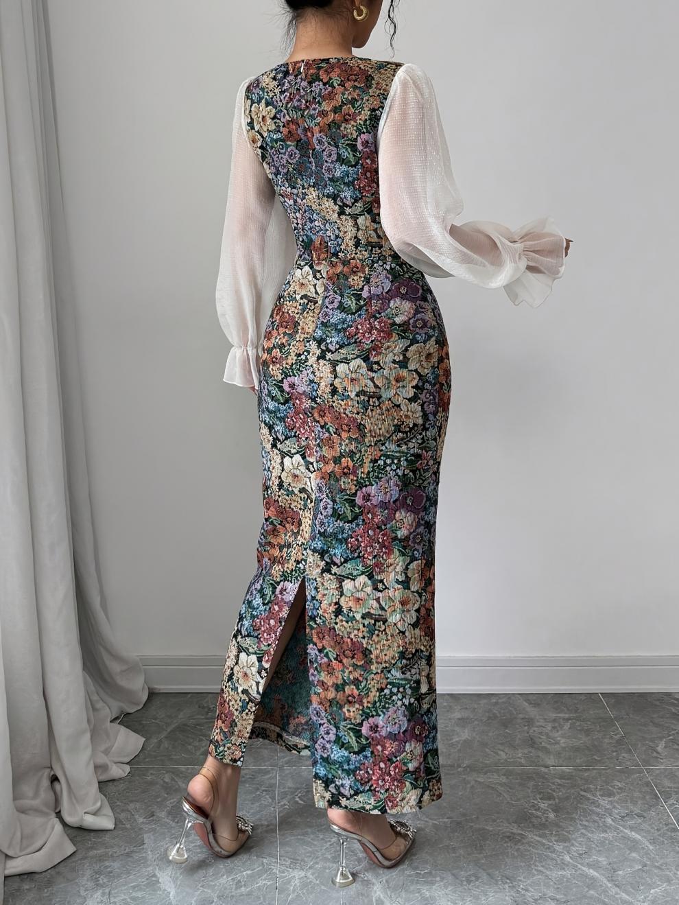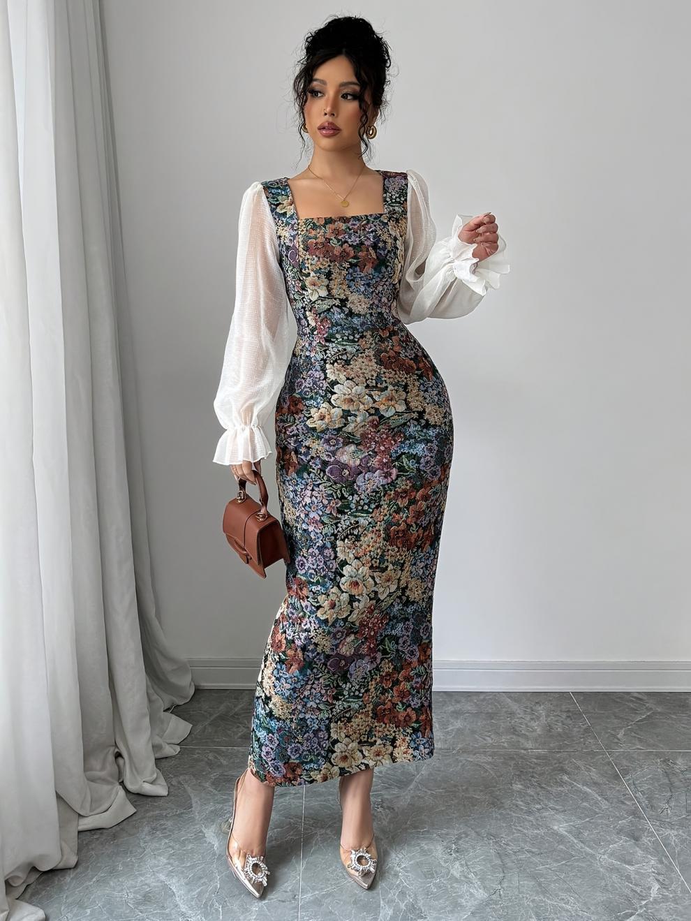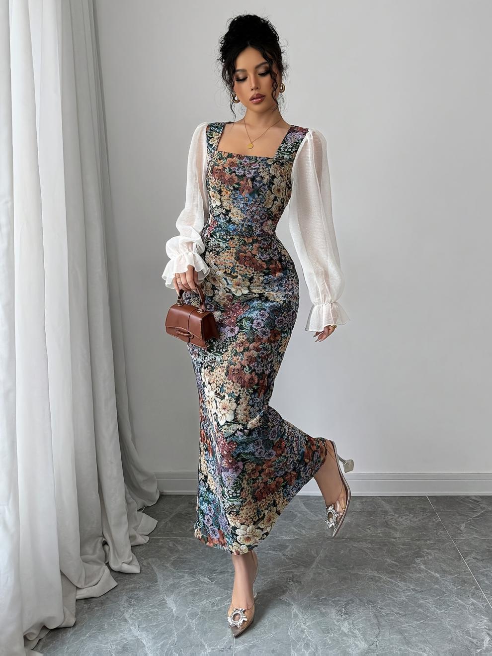 فستان أنيق للنساء من قماش الكانفاس الزيتي والشيفون ذو الرقبة المربعة