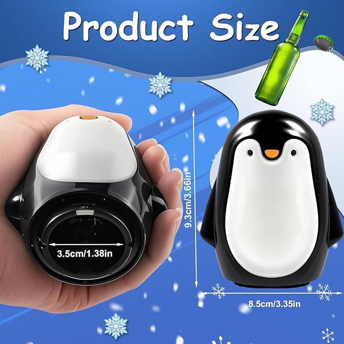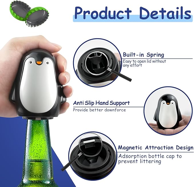| وصف | فتاحة زجاجات أوتوماتيكية مصممة على شكل بطريق كرتوني لطيف ، أداة مطبخ عملية ومبتكرة تهدف إلى تسهيل فتح الزجاجات دون عناء ، يكفي وضع الفتاحة فوق غطاء الزجاجة والضغط عليها لفتحها بشكل آلي وسلس ، مثالية للاستخدام بيد واحدة |