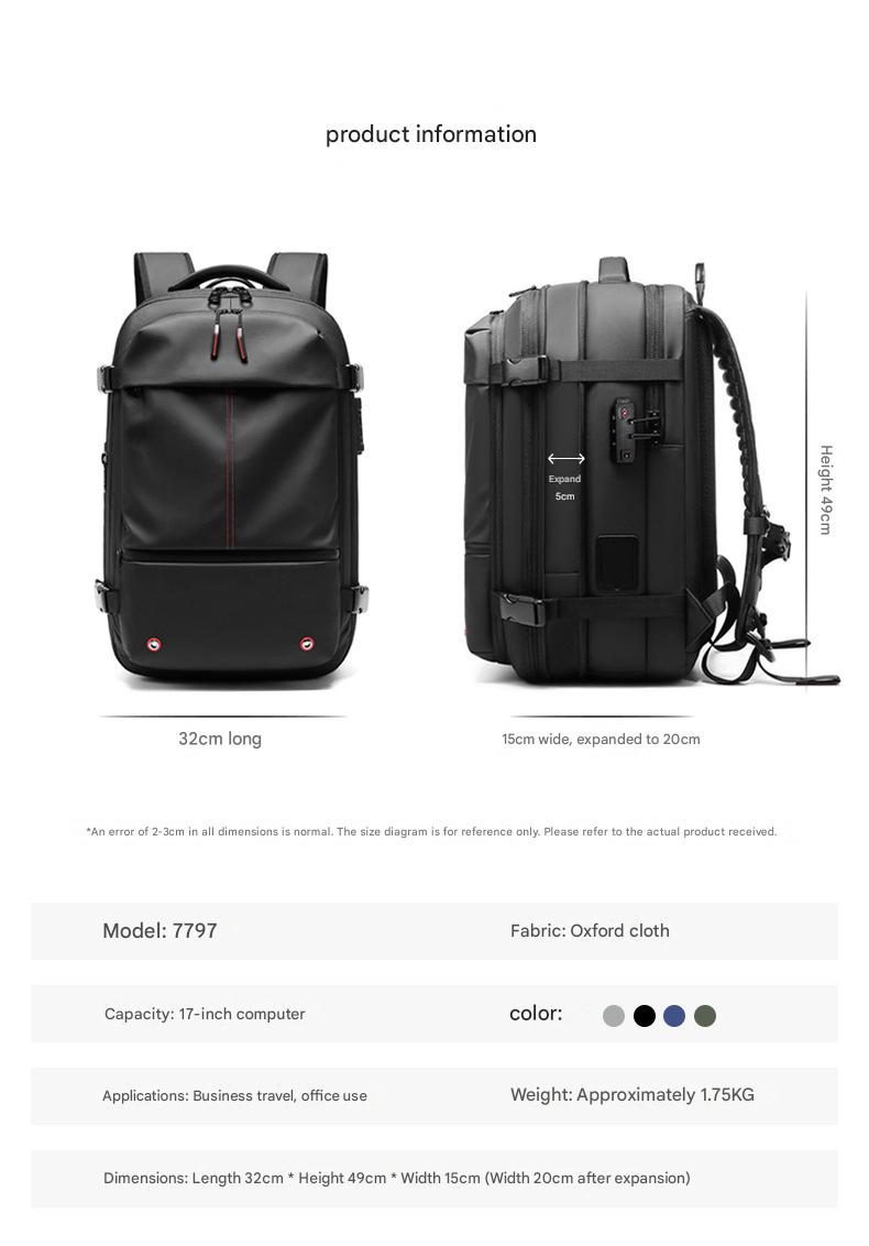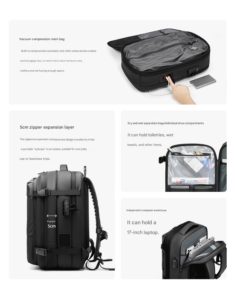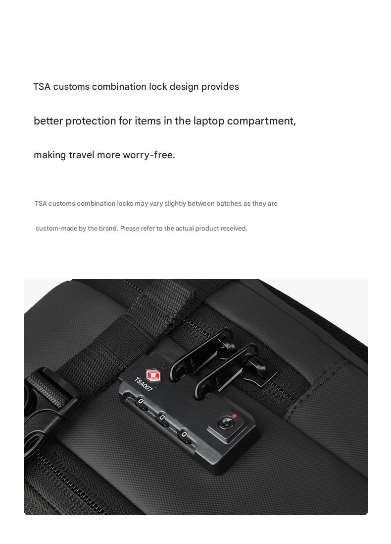 حقيبة ظهر مبتكرة وعصرية مصمّمة لتلبية احتياجات السفر والعمل اليومي. تأتي بلون أسود والازرق والرمادي ومصنوعة من مواد عالية الجودة مقاومة للماء، مما يمنحك حماية مثالية لممتلكاتك في مختلف الظروف. تتميز الحقيبة بسعة كبيرة قادرة على استيعاب لابتوب يصل حجمه إلى 17 بوصة، إضافة إلى جيوب متعددة لتنظيم الأغراض الشخصية بسهولة.