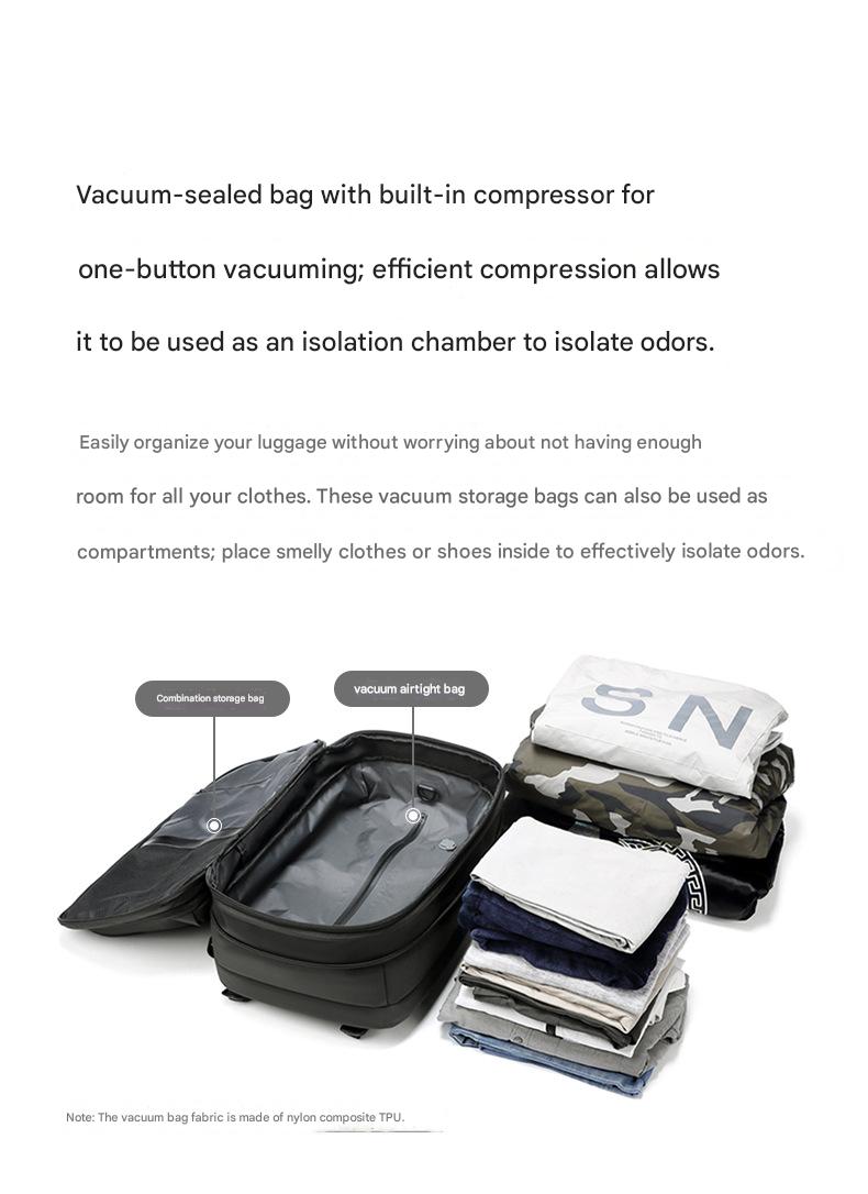 تأتي أيضاً بنظام سحب هواء بلمسة واحدة للحفاظ على شكل الحقيبة ومحتوياتها.
