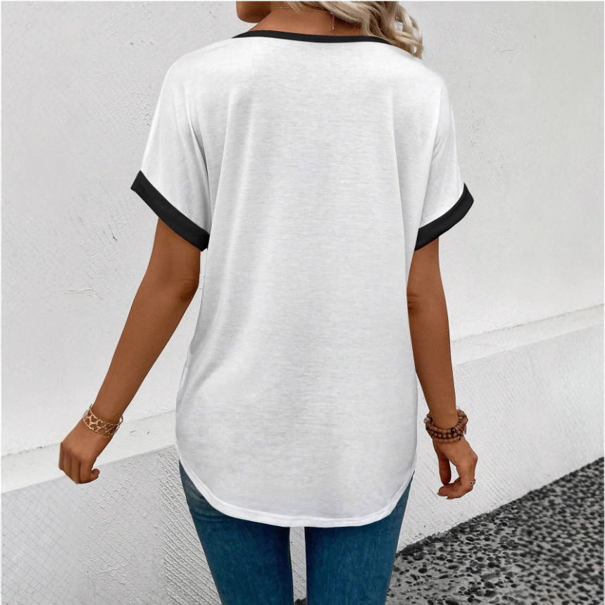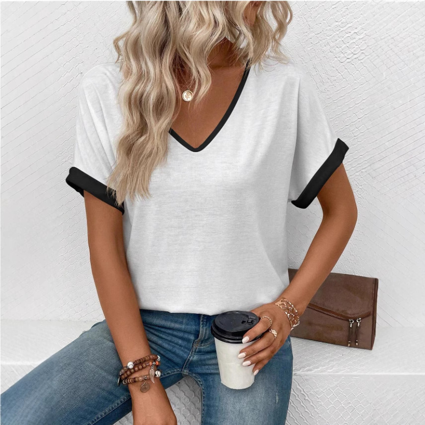 تيشيرت نسائي قصير الأكمام بياقة على شكل حرف V