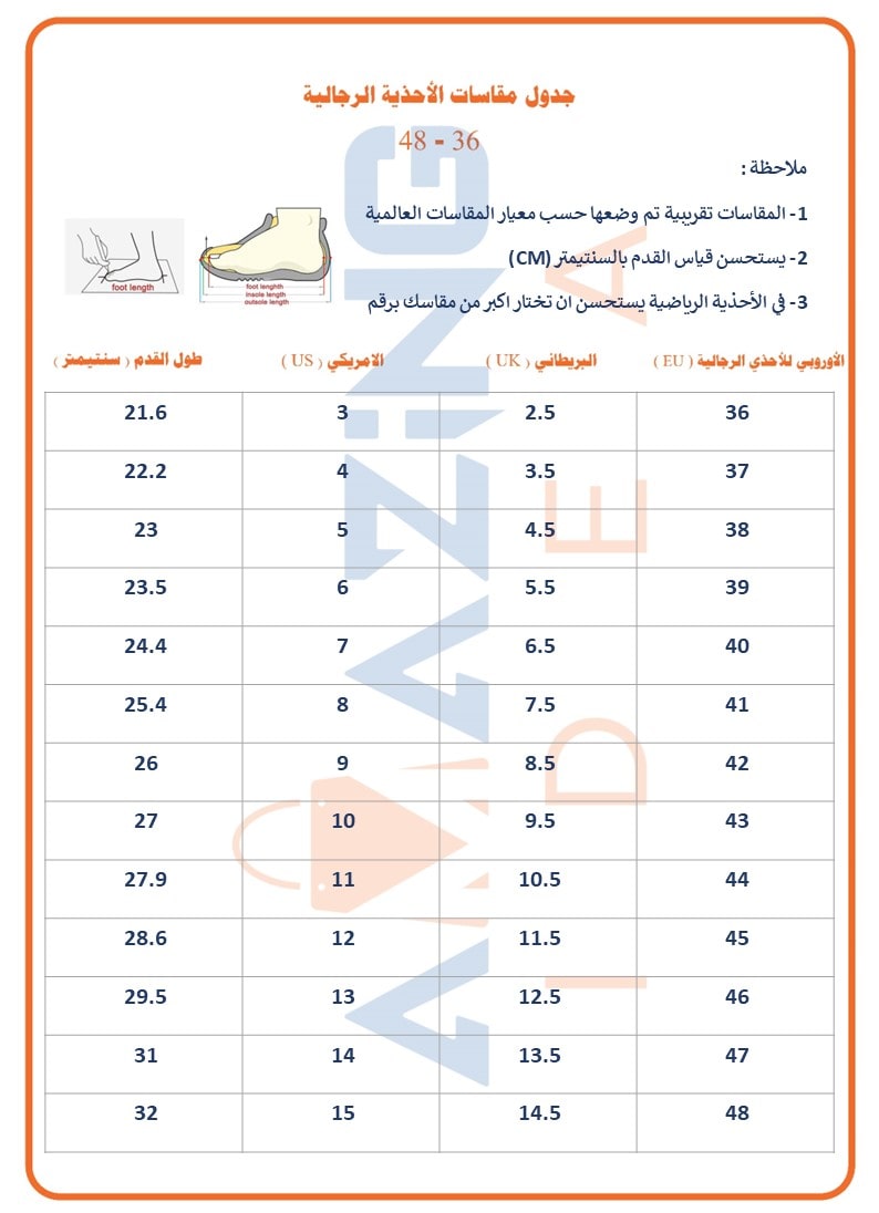 | المقاس | 36 - 37 - 38 - 39 - 40 - 41 - 42 - 43 - 44 - 45 - 46 - 47 |