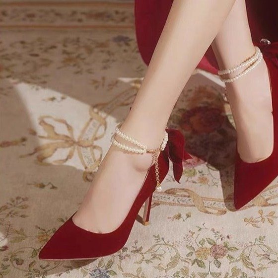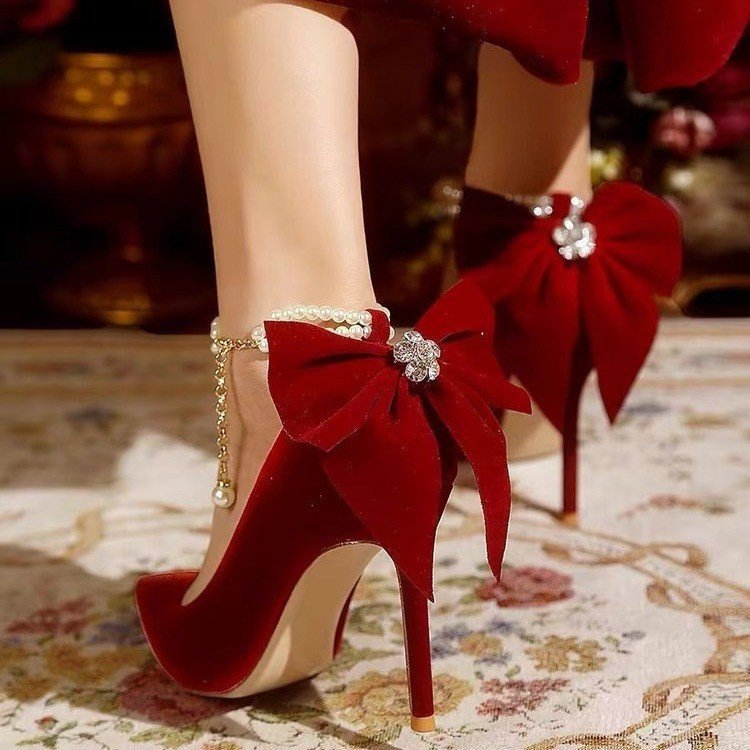 حذاء أحمر بكعب عال ورفيع مزين بلؤلؤ وفيونكة