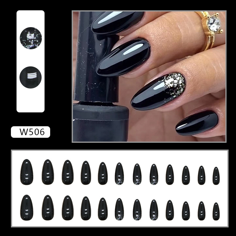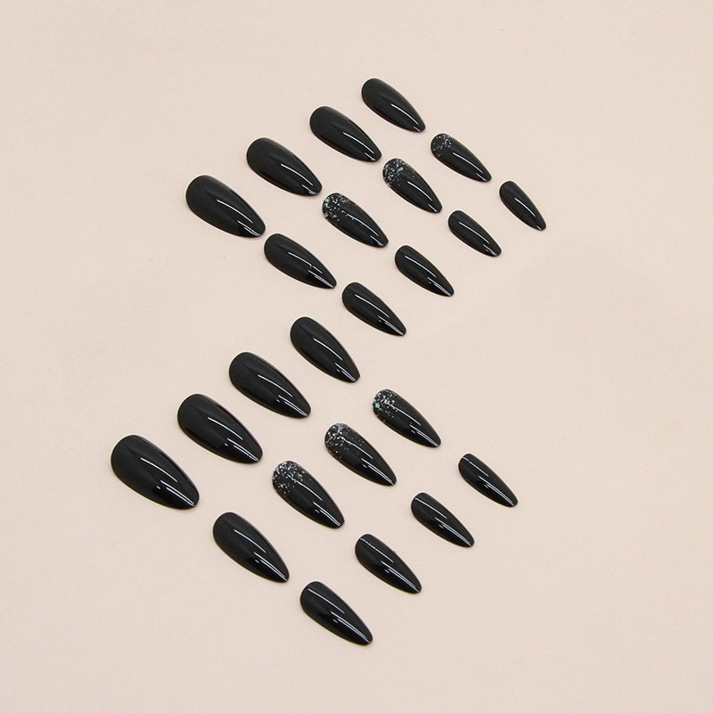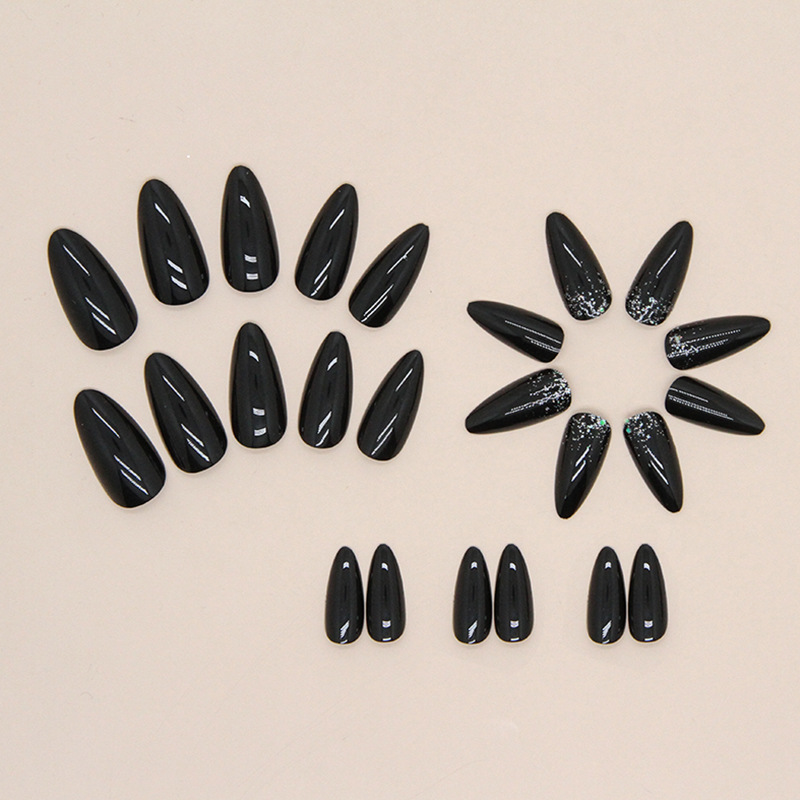 أظافر لوزية أنيقة ورائعة من مسحوق فضي أسود نقي 24 قطعة