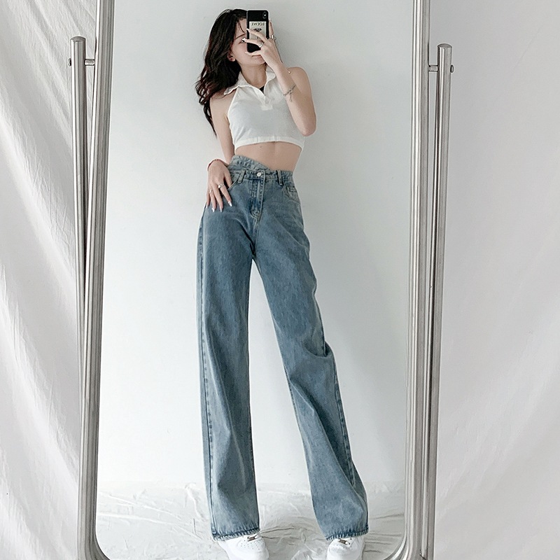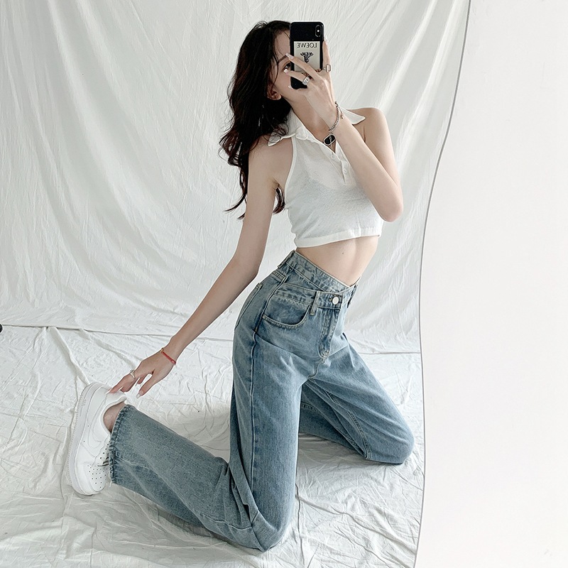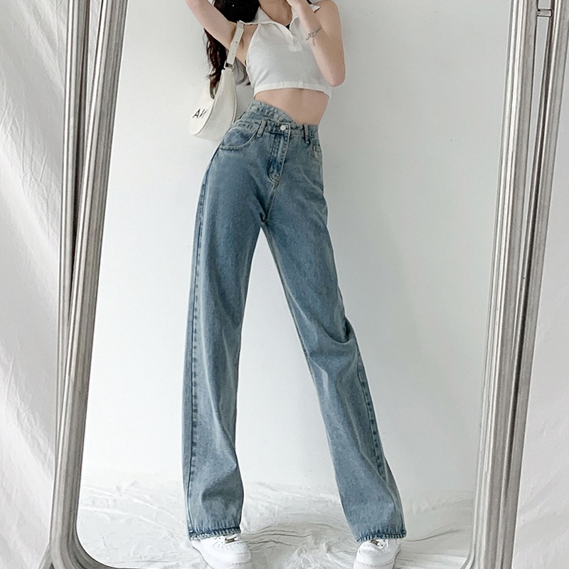 بنطلون جينز نسائي واسع الساق بخصر عالٍ ومشبك مائل بنمط كوري