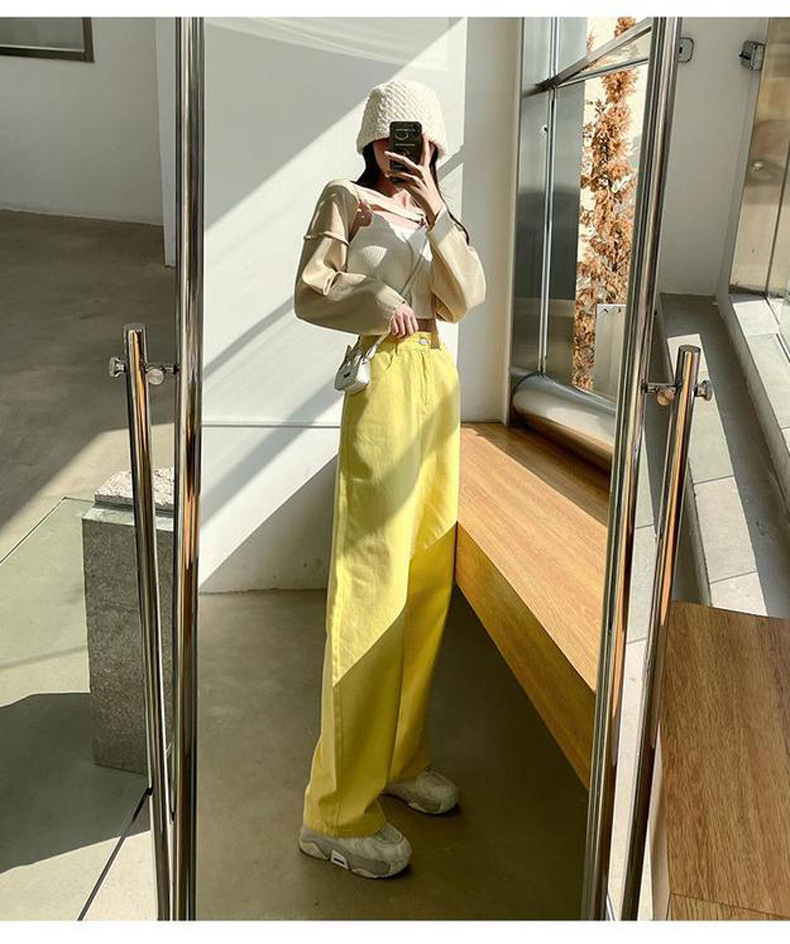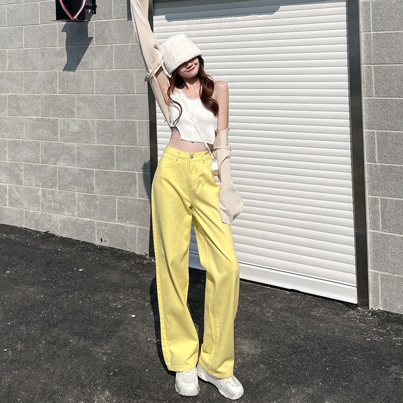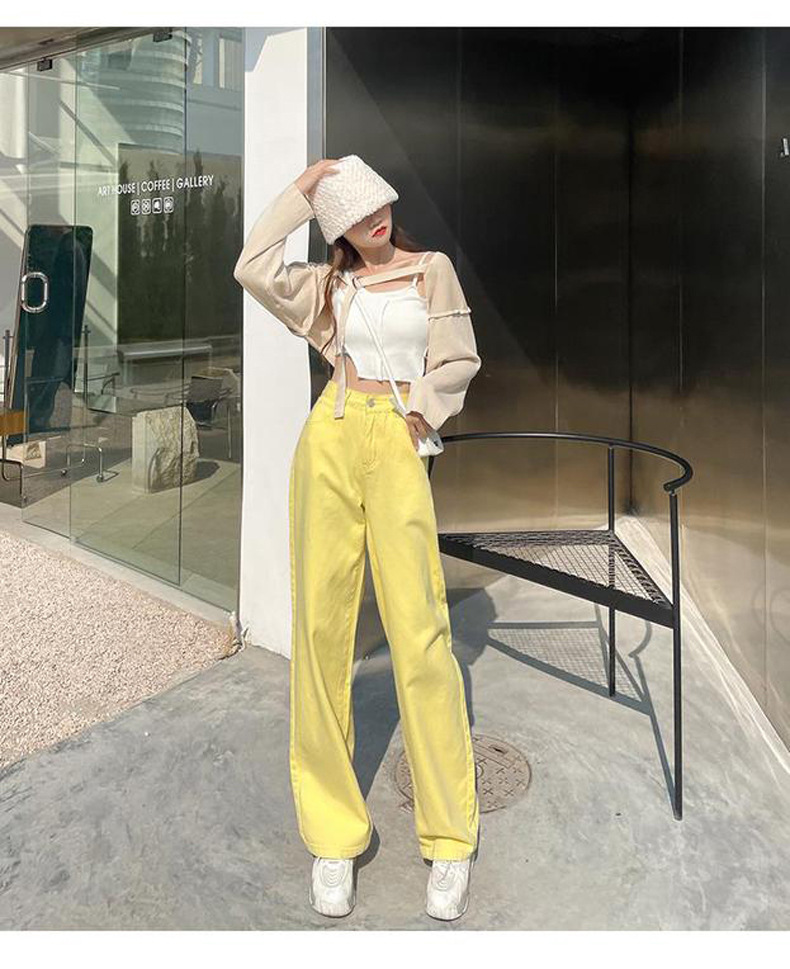 بنطلون جينز نسائي صيفي بخصر عالٍ فضفاض ومستقيم بألوان سادة