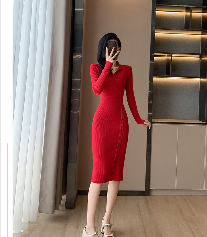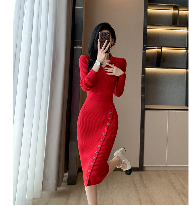 فستان شتوي مكمم ميدي وبأزرار أمامية للسيدات