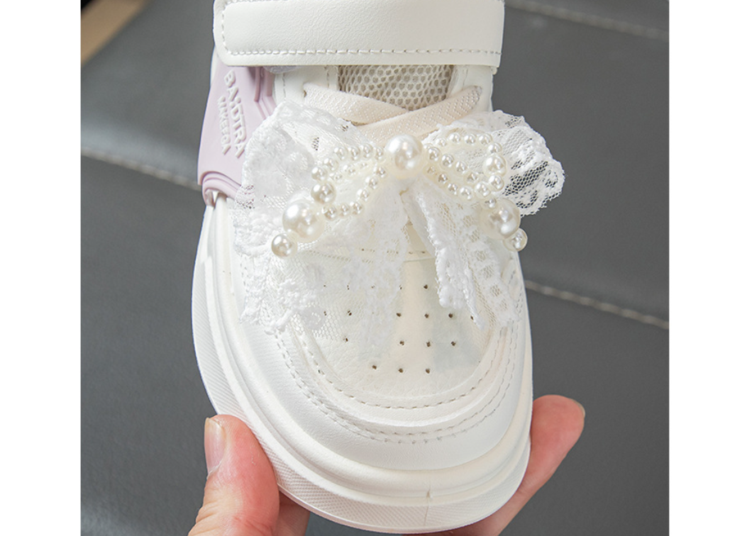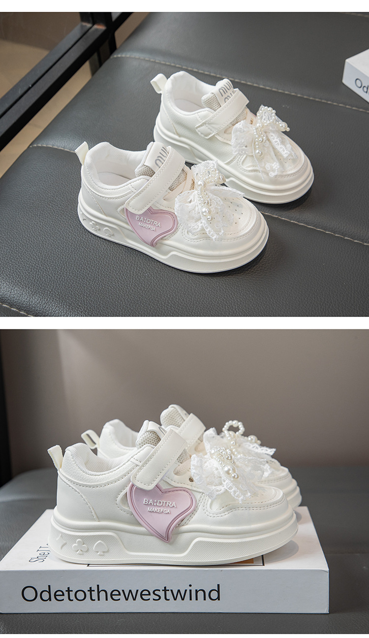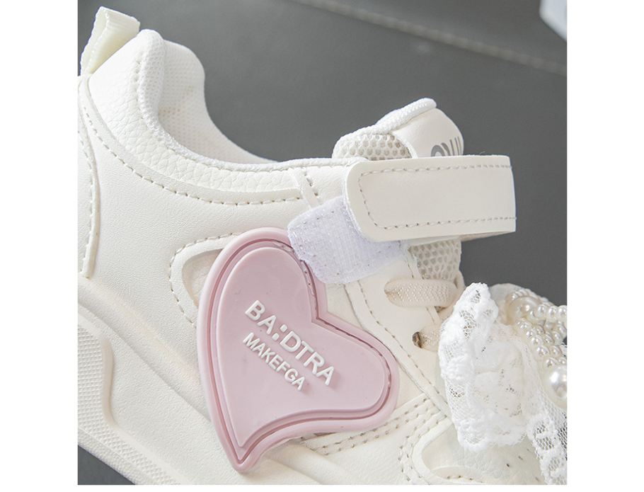 حذاء رياضي جلدي أبيض بفيونكة ورباط ولاصق أمامي للفتيات