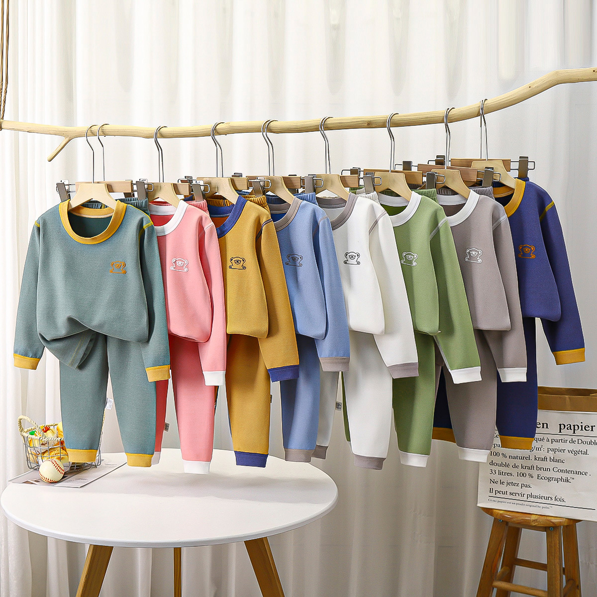 بيجامة شتوية بألوان سادة وهادئة مناسبة للنوم بتصميم كلاسيكي للأطفال