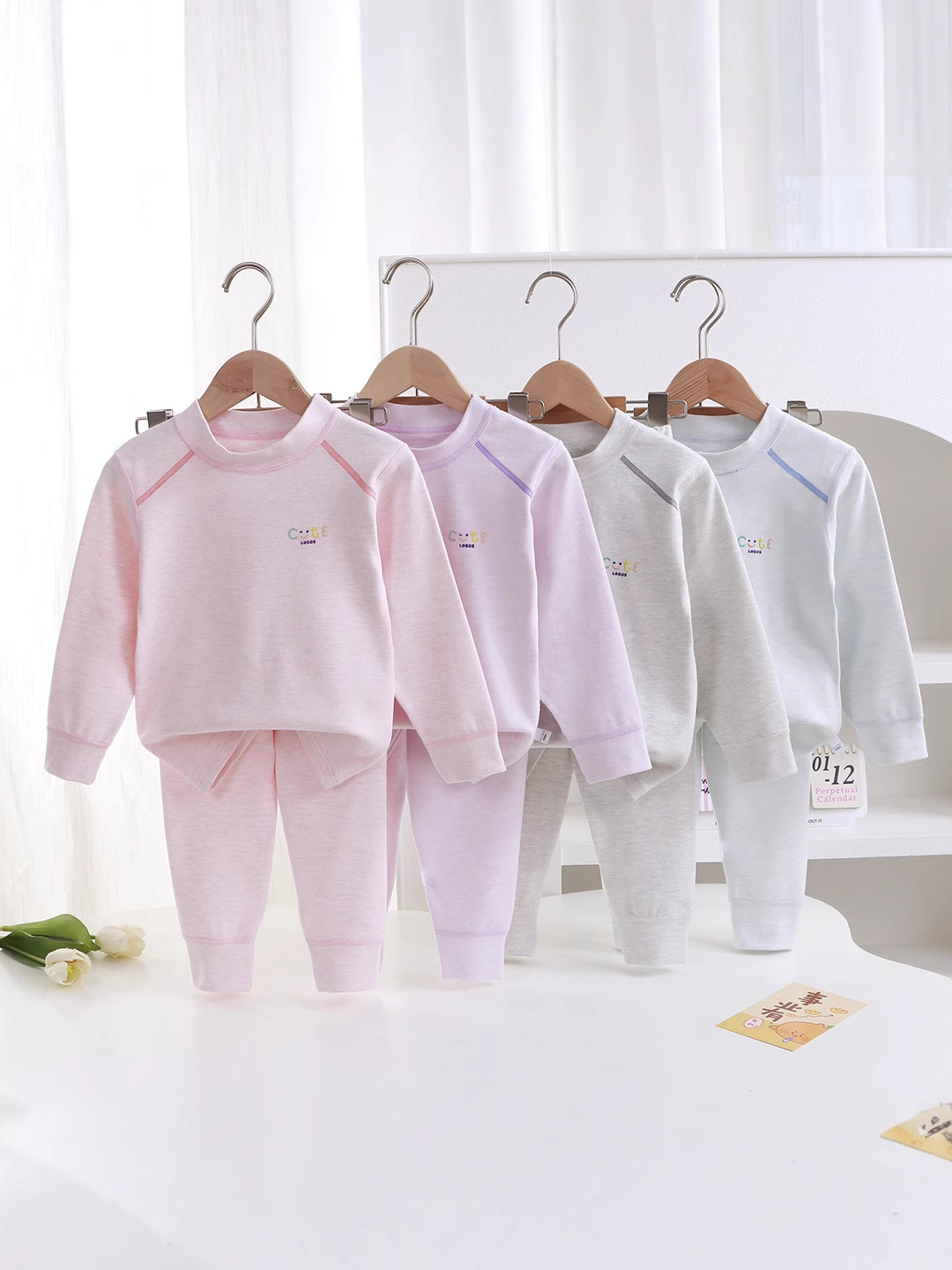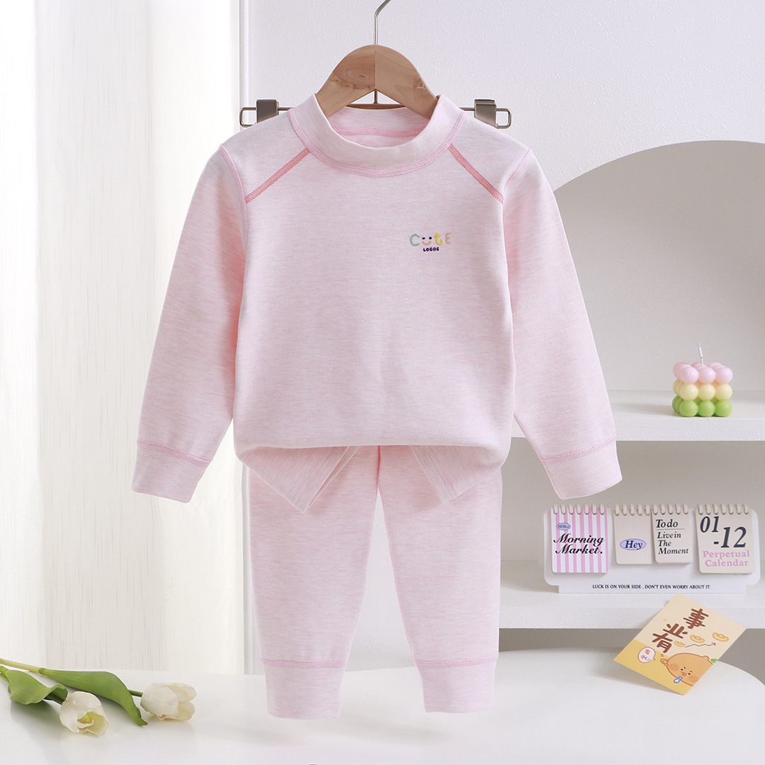 طقم بيجامة بأكمام ورقبة دائرية وبنطال طويل بألوان سادة للاطفال