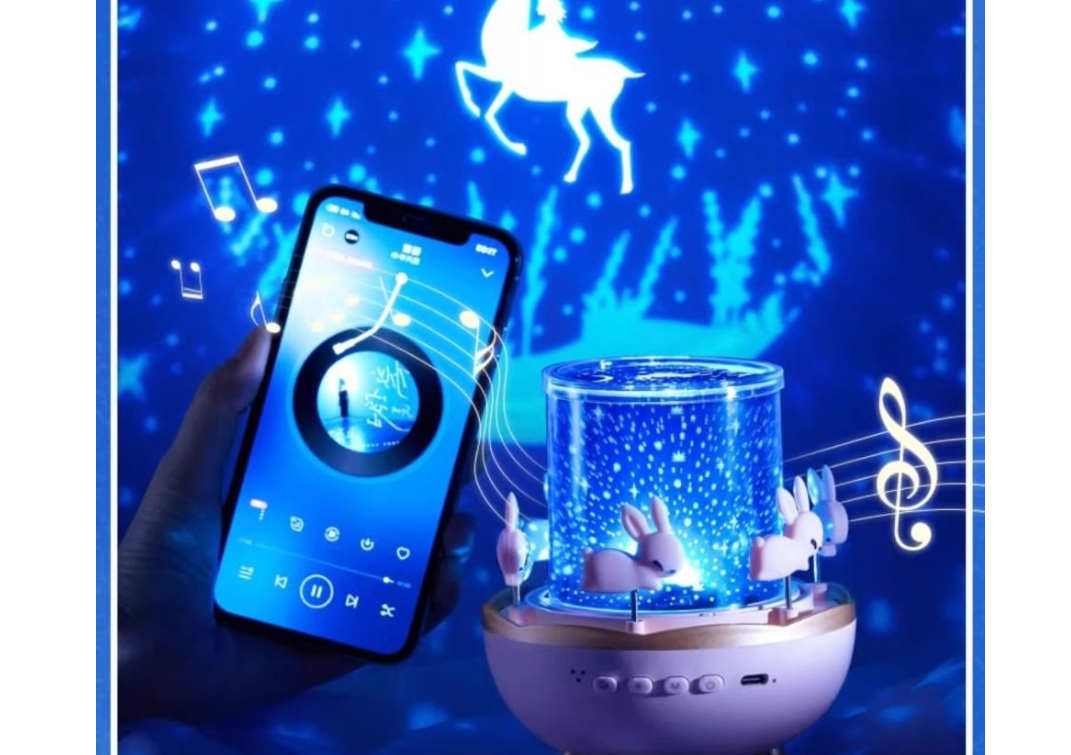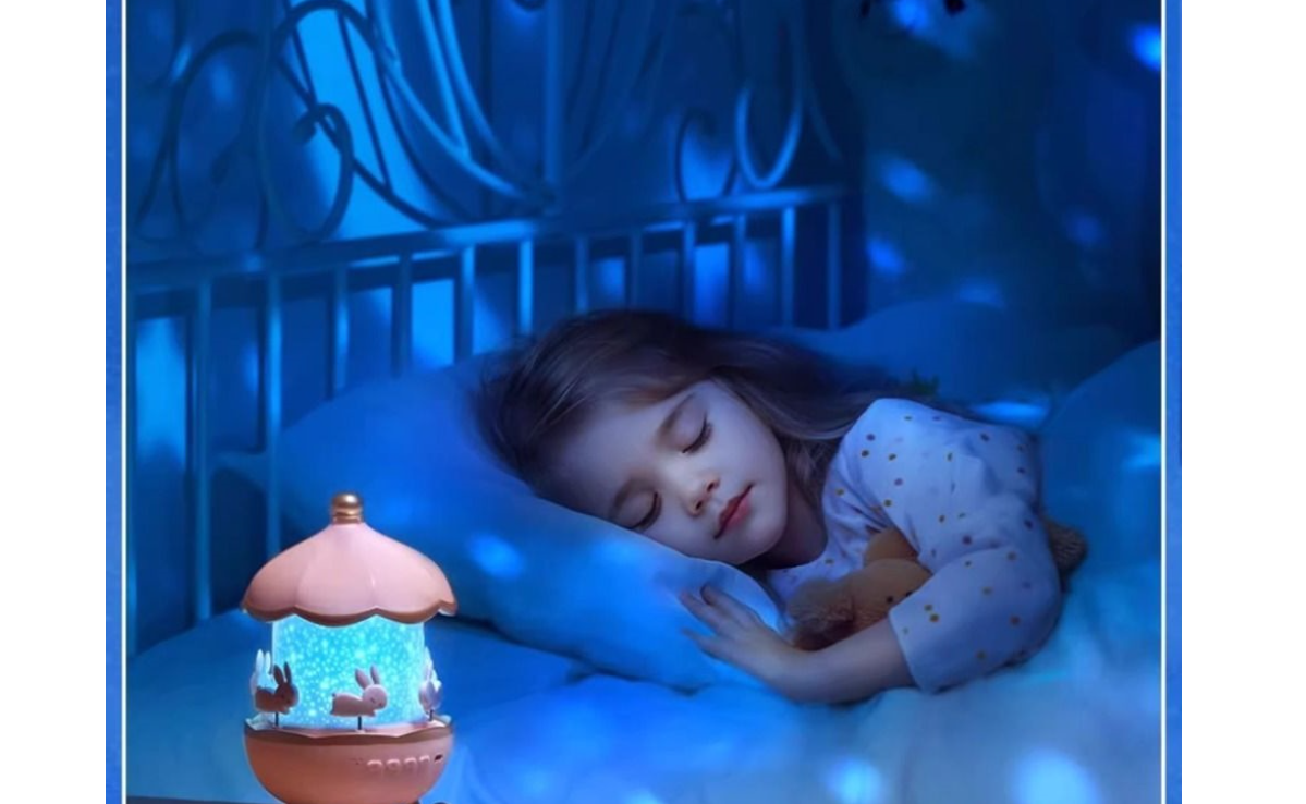 وصف | مصباح بروجيكتور ليلي للأطفال بتصميم إبداعي ساحر يجمع بين الإضاءة والخيال - مصباح مزين بأرانب صغيرة تدور بشكل دائري - مصباح ضوئي مع إمكانية التحكم عبر الأزرار الأمامية لتغيير الأوضاع أو تشغيل الموسيقى المدمجة. |