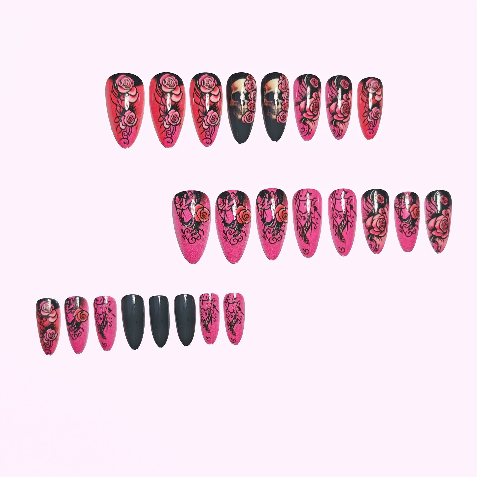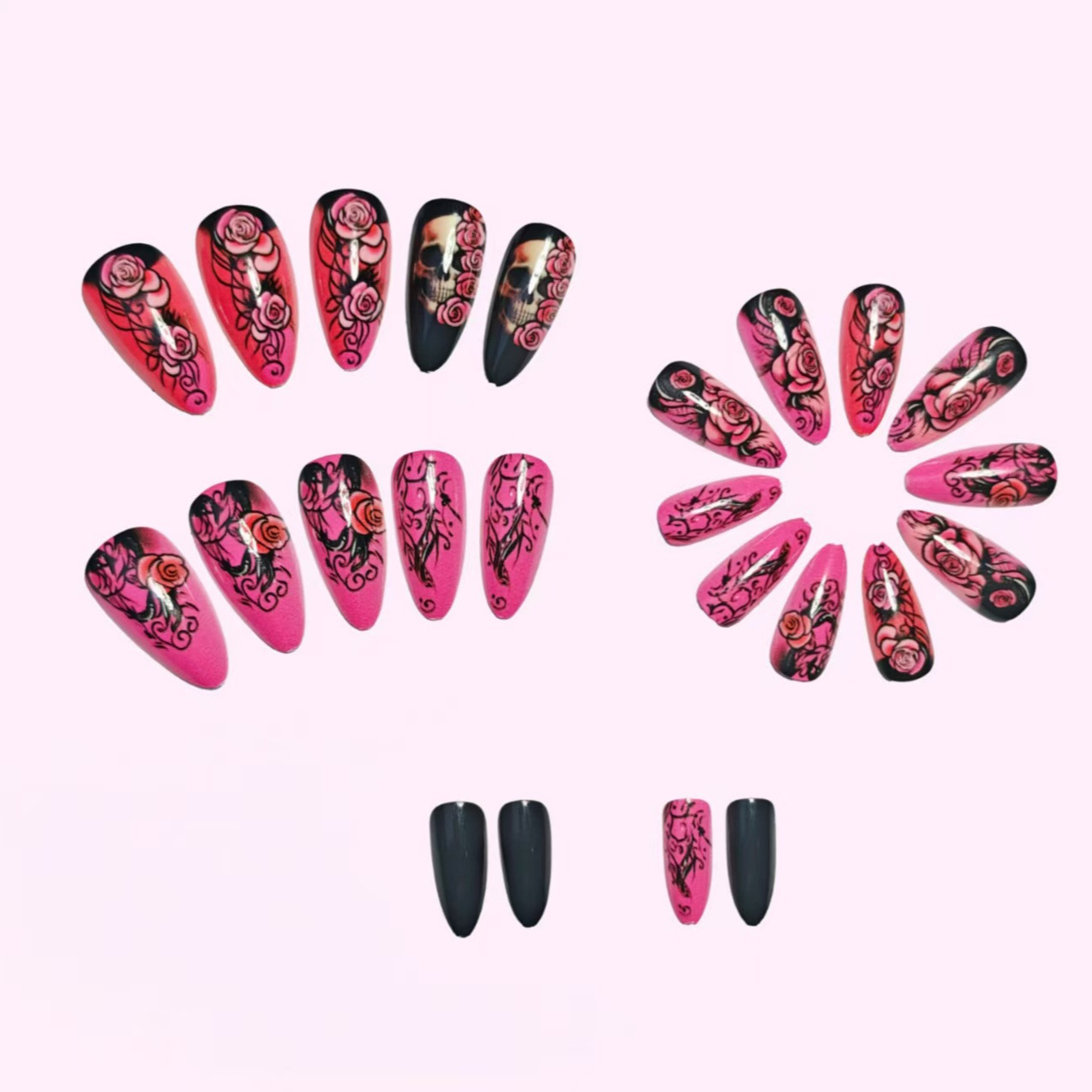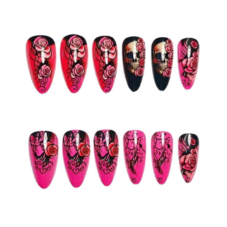 اظافر الهالوين بتصميم جمجمة ووردة الليل الداكنة