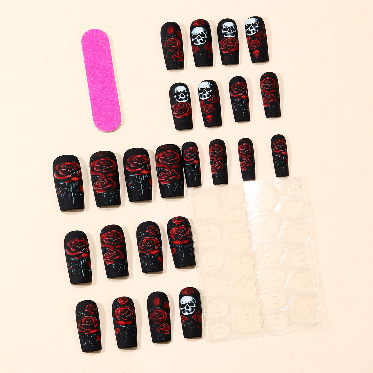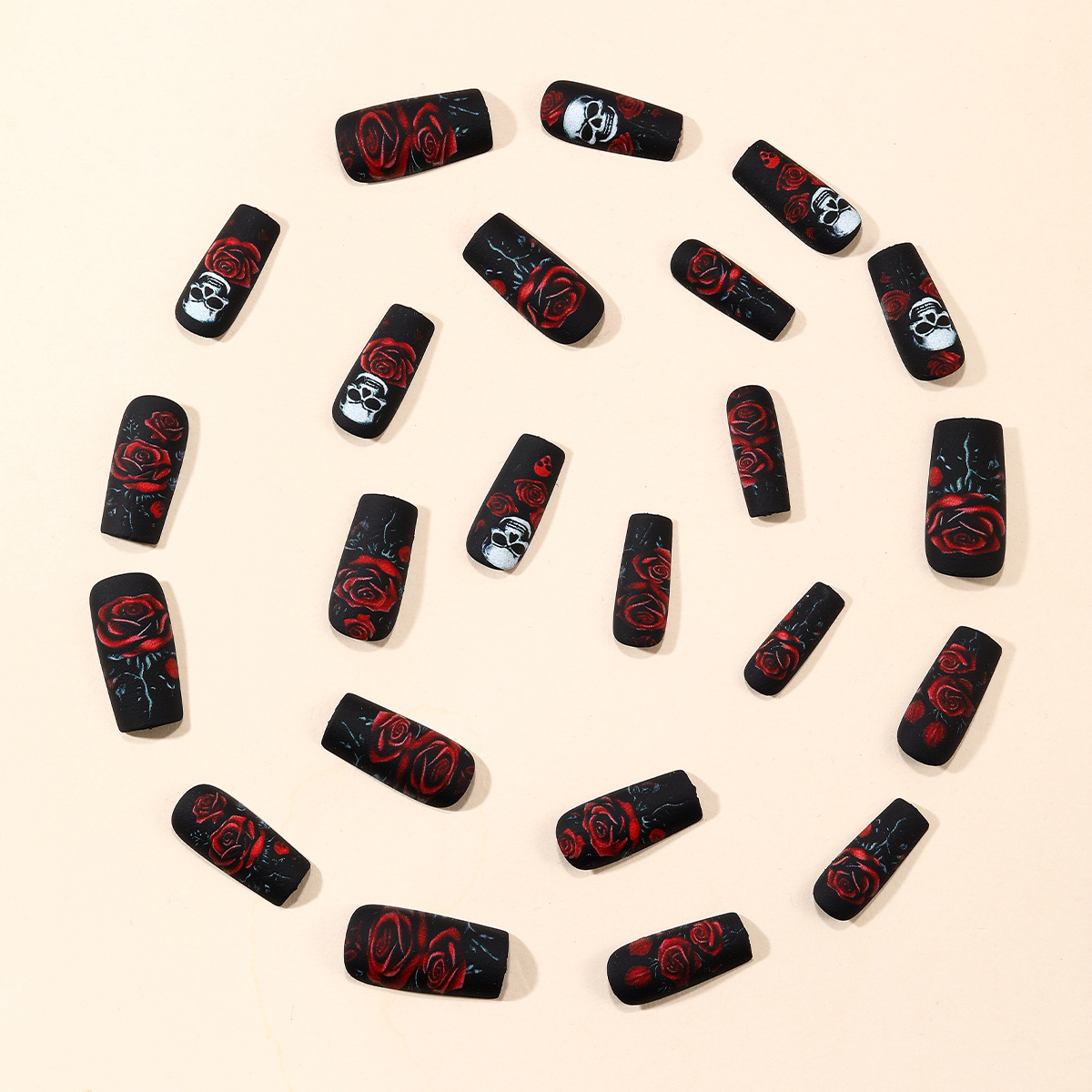 أظافر صناعية قابلة للإزالة بطابع الهالوين بتصميم جمجمة ووردة / 24 قطعة