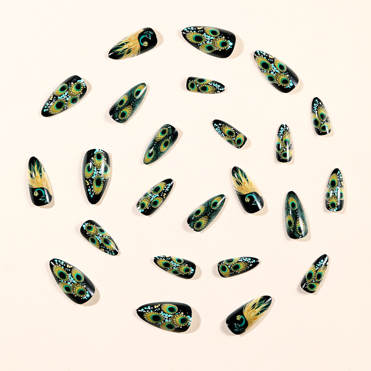 أظافر صناعية قابلة للفك والتركيب مطبوعة بنقشة طاووس / 24 قطعة