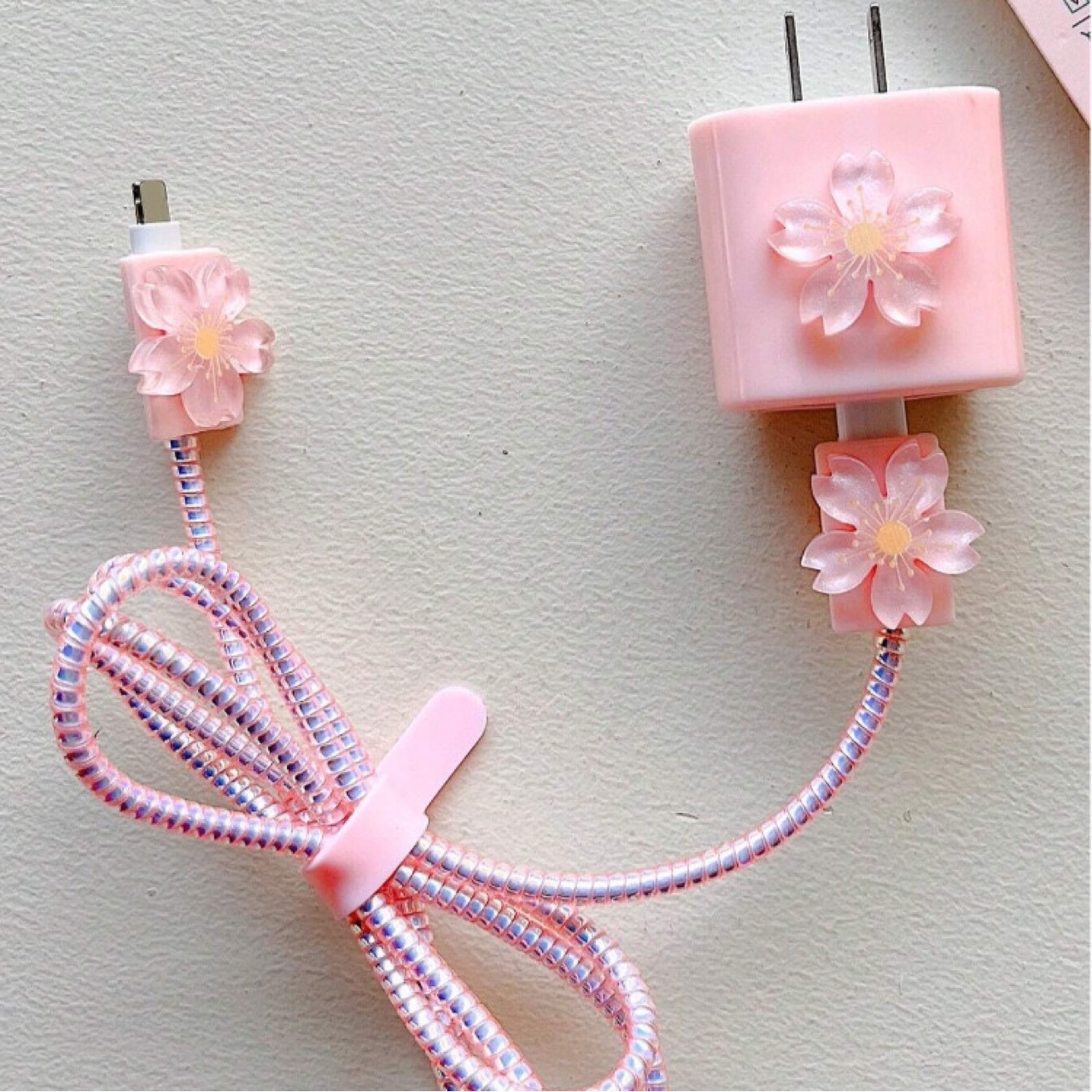 حافظة شاحن وردي مع كيبل مزين بزهور ناعمة للفتيات