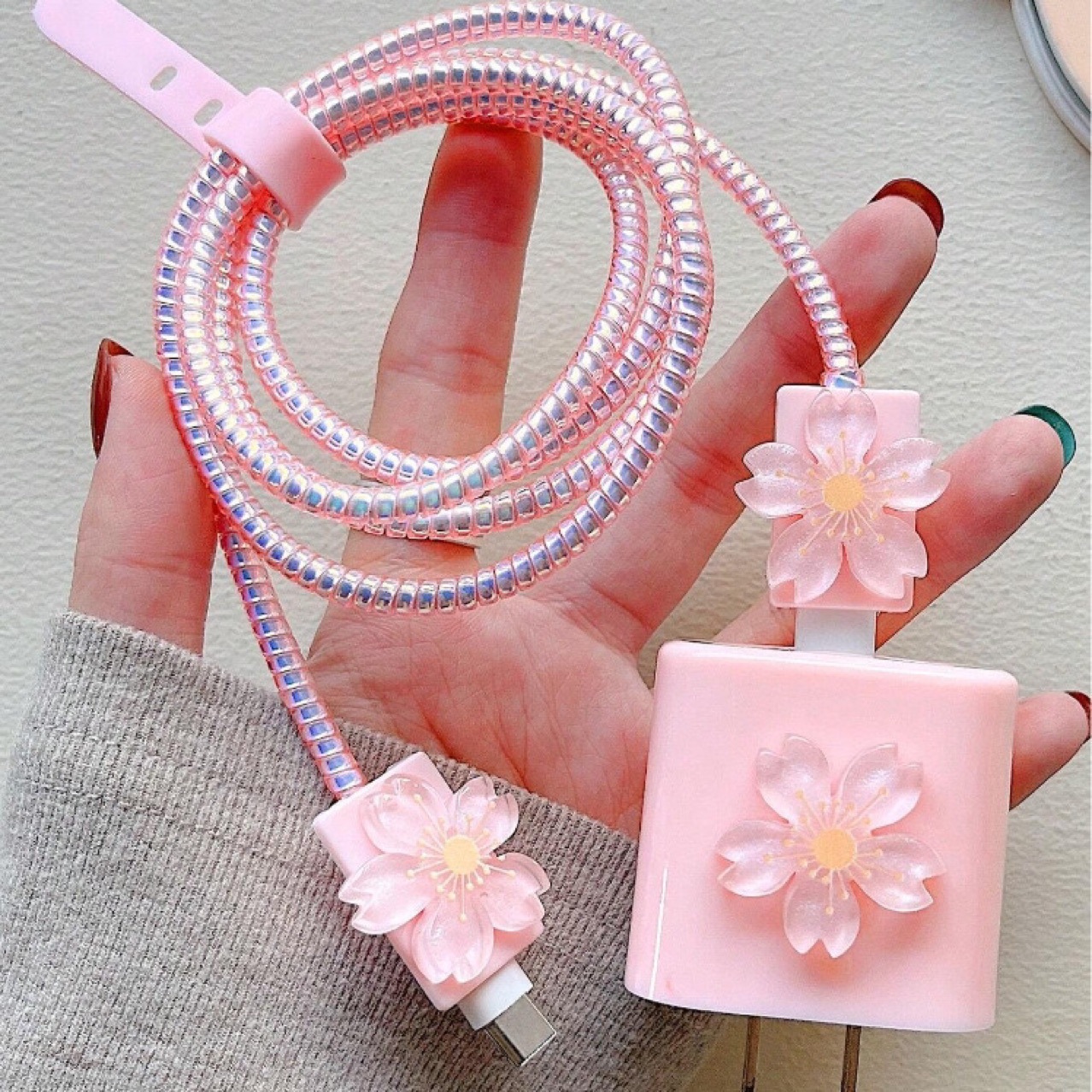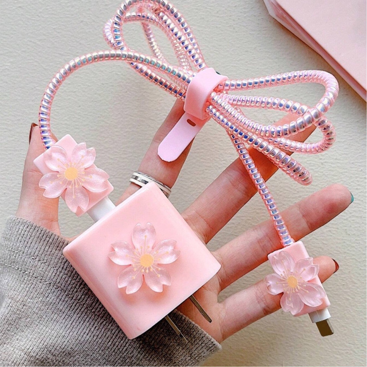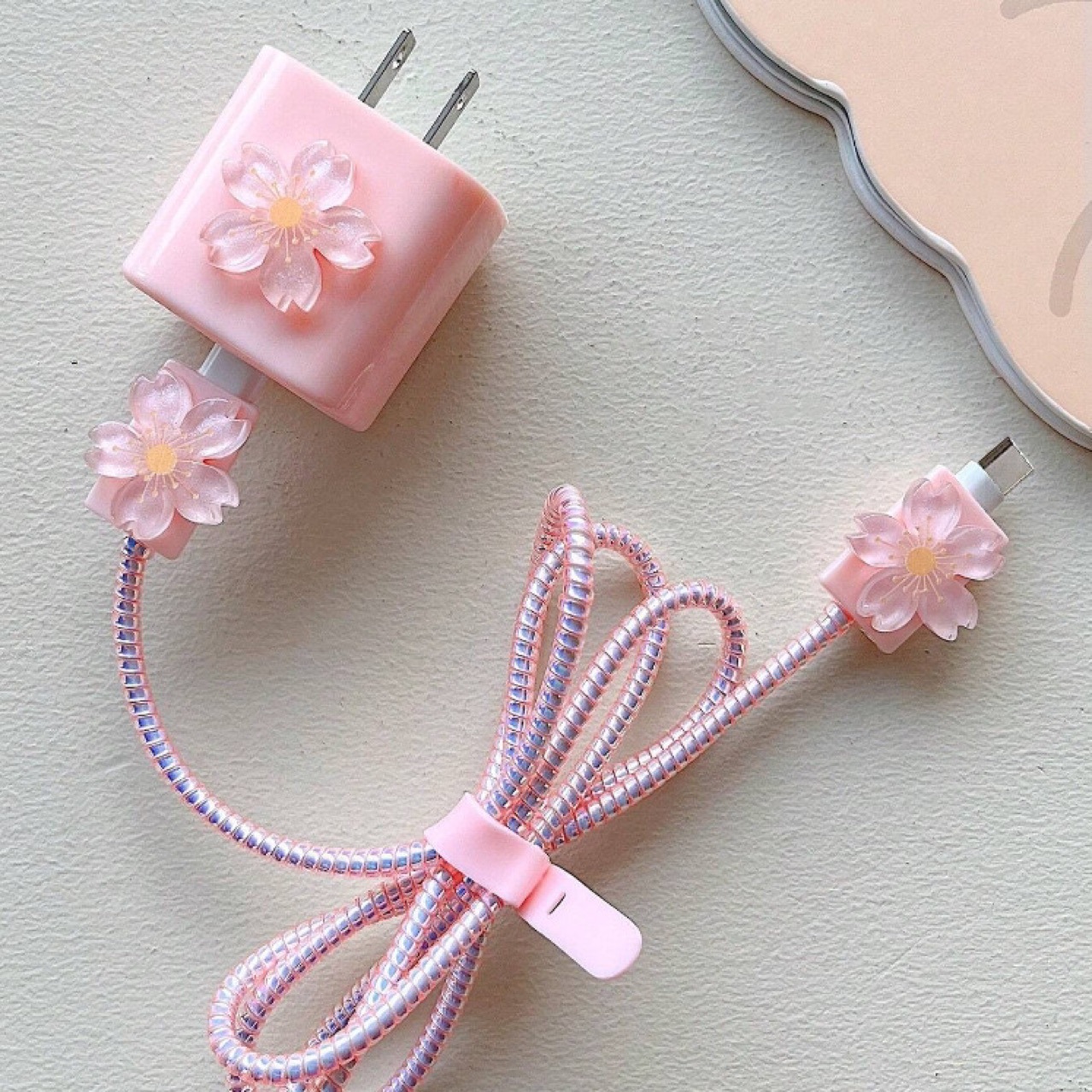 | وصف | غطاء حماية بلون زهرة الكرز الوردي الرقيق لشواحن ابل 18/20 وات مع قبضة كابل وكابل حماية كابل البيانات |