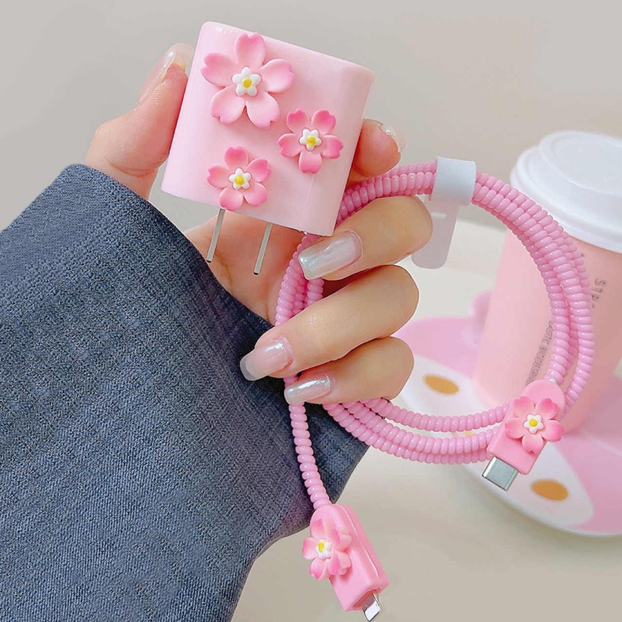 شاحن مع كيبل آيفون وردي مزخرف بزهور ناعمة