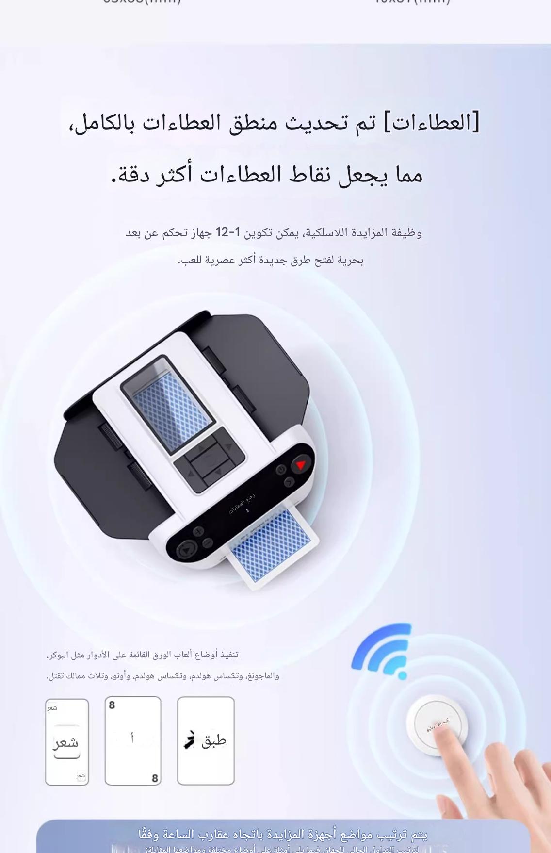 | وصف | موزع بطاقات سريع ومختار - جهاز غسيل وتوزيع البطاقات الكل في واحد للعبة دو ديزو - صُمم هذا الجهاز لأتمتة عملية خلط وتوزيع الأوراق -فهو مزود ببطارية مدمجة قابلة لإعادة الشحن وتصميم مضغوط، مما يجعله محمولاً - موزع بطاقات أوتوماتيكي |