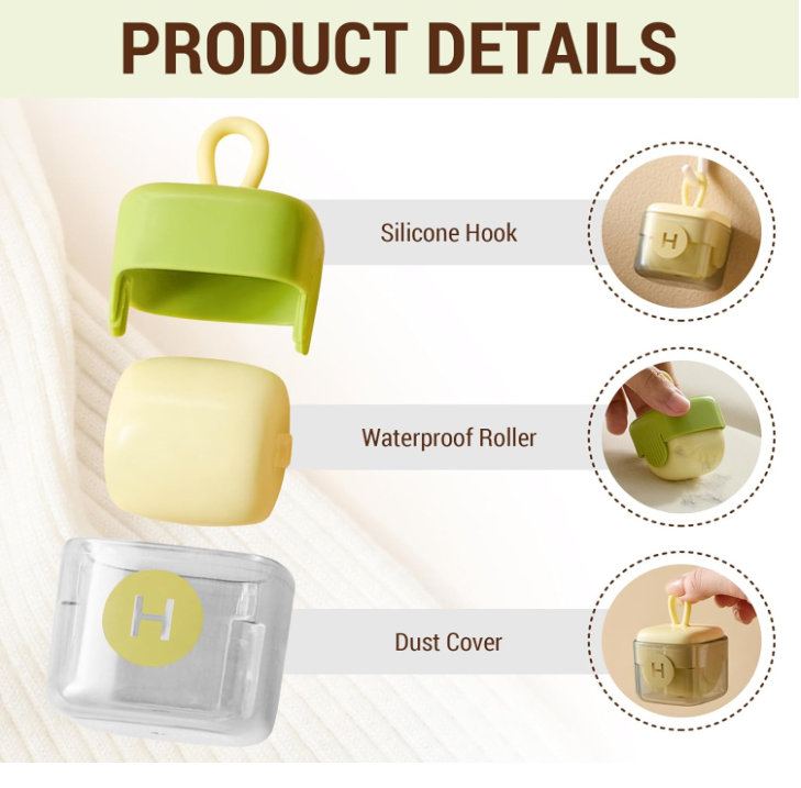 | وصف | أسطوانة إزالة الوبر صغيرة محمولة قابلة لإعادة الاستخدام والغسل - إسطوانة لإزالة الوبر اليدوية مع سطح جل قابل للغسل - صُممت لإزالة شعر الحيوانات الأليفة والغبار والوبر من الملابس والأثاث والأقمشة الأخرى |