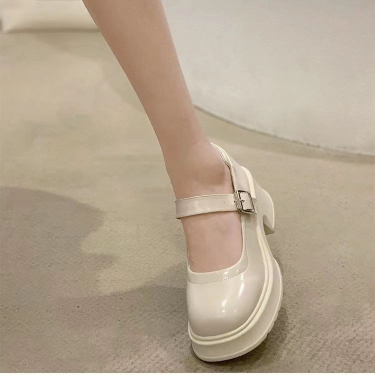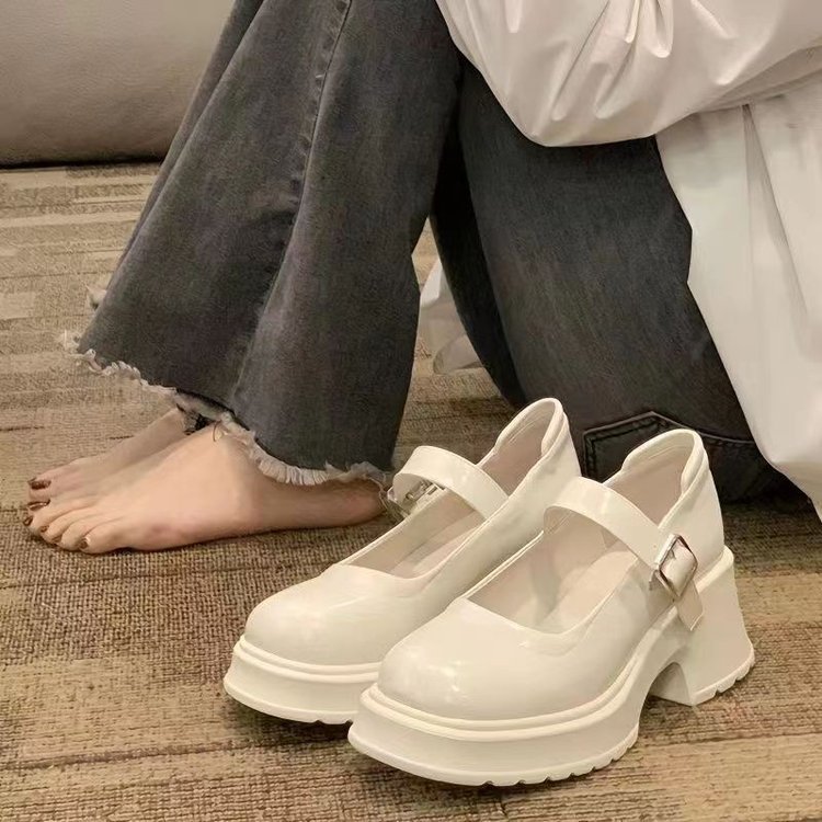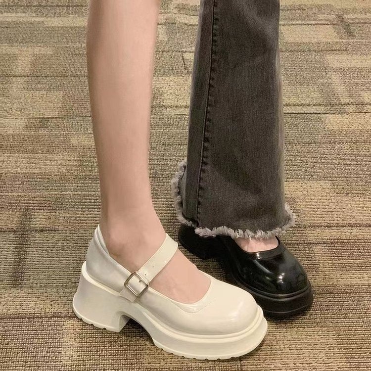 زوج من أحذية ماري جين جلدي بكعب سميك للفتيات