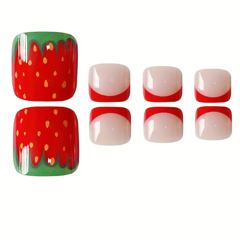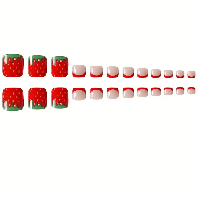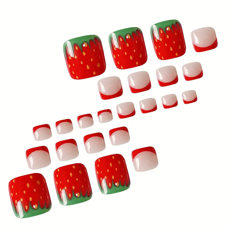 ملصقات أظافر فرنسية متدرجة حمراء على شكل فراولة كرتونية لطيفة - 24 قطعة