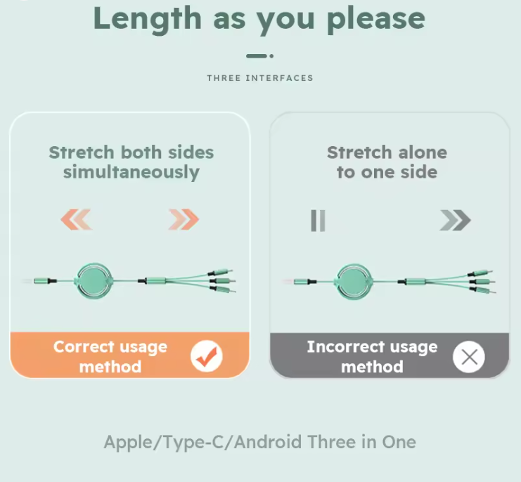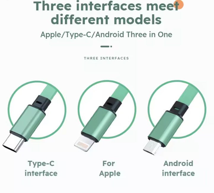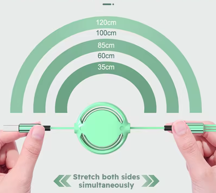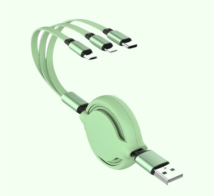 | وصف | تُظهر الصورة كابلات شحن قابلة للسحب 3 في 1- تتميز هذه الكابلات بموصلات متعددة لشحن أجهزة متعددة في آنٍ واحد - التصميم: يساعد التصميم القابل للسحب على منع التشابك - مصنوعة من مادة السيليكون الناعمة والسائلة والتي توصف بأنها صديقة للبشرة. |