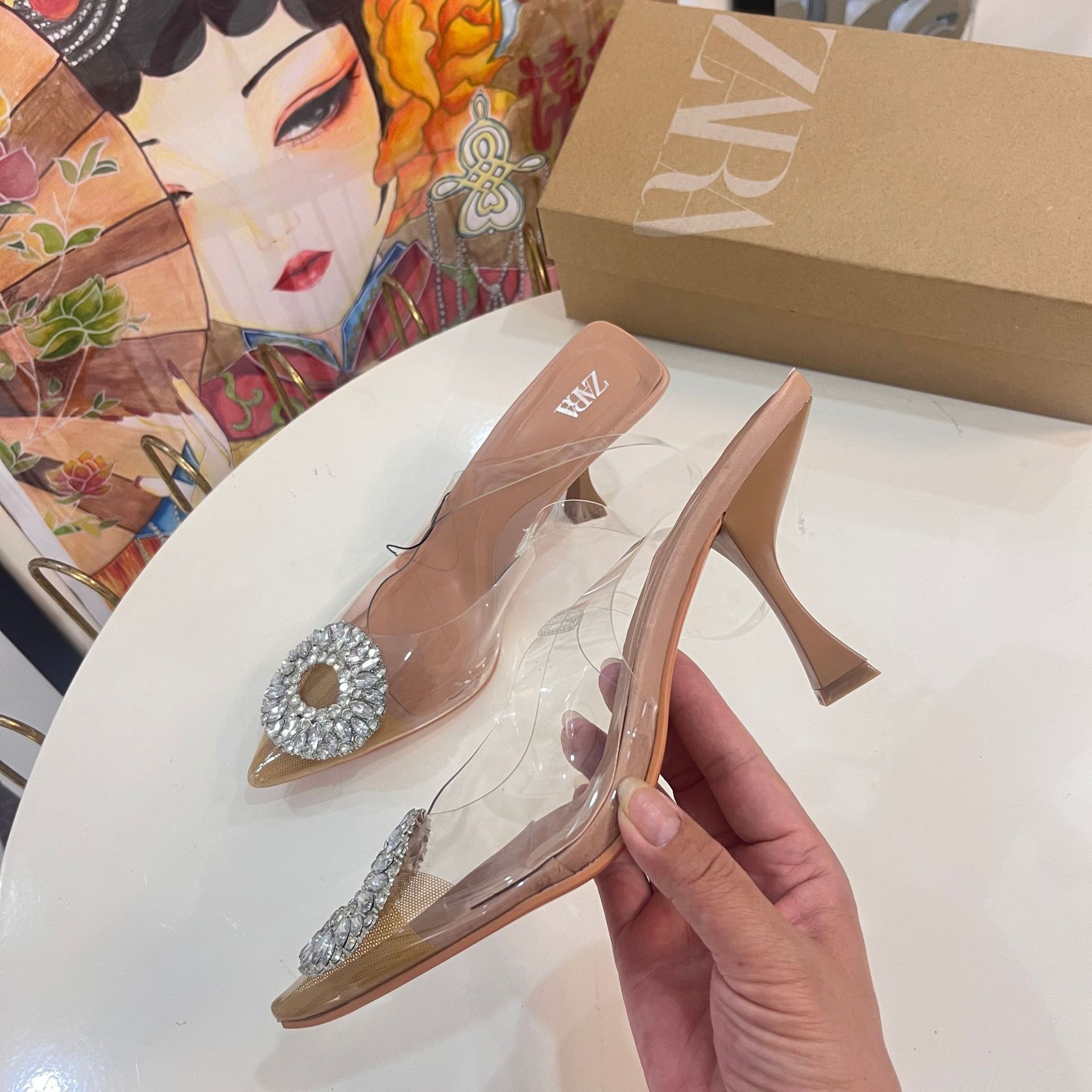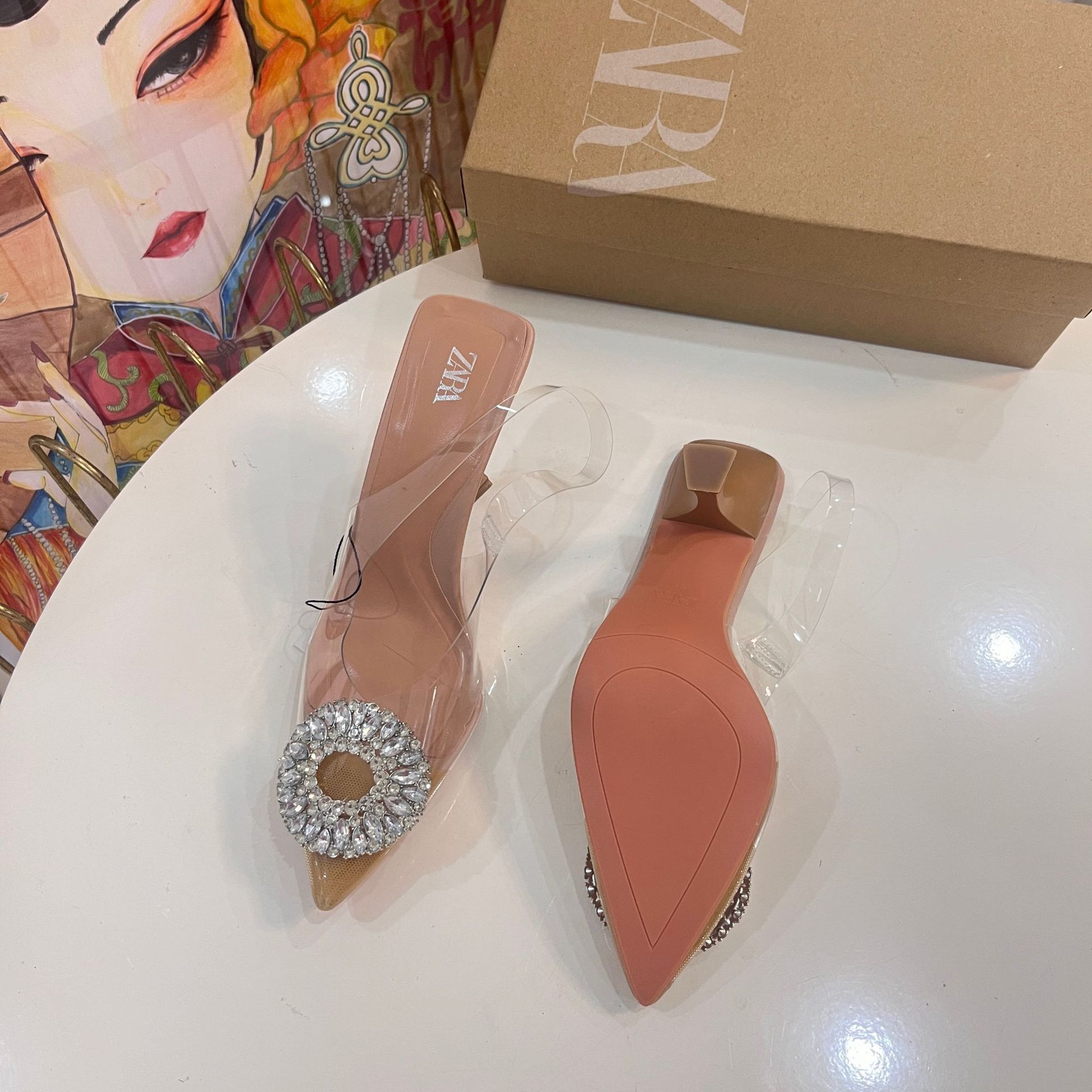 أحذية شفافة مرصعة بأحجار الراين بكعب متوسط الإرتفاع ومقدمة مدبدبة للنساء