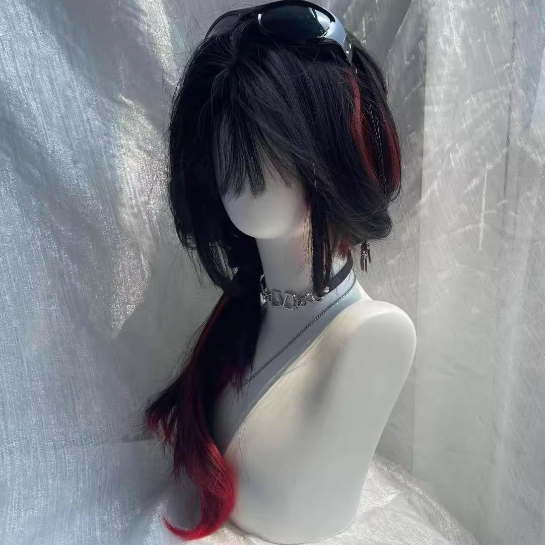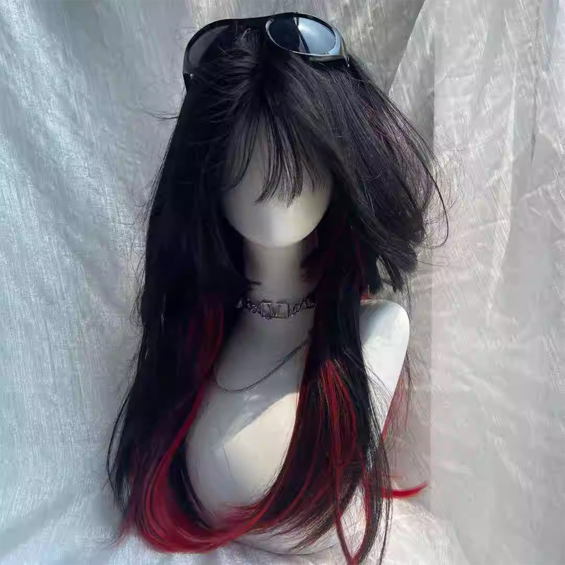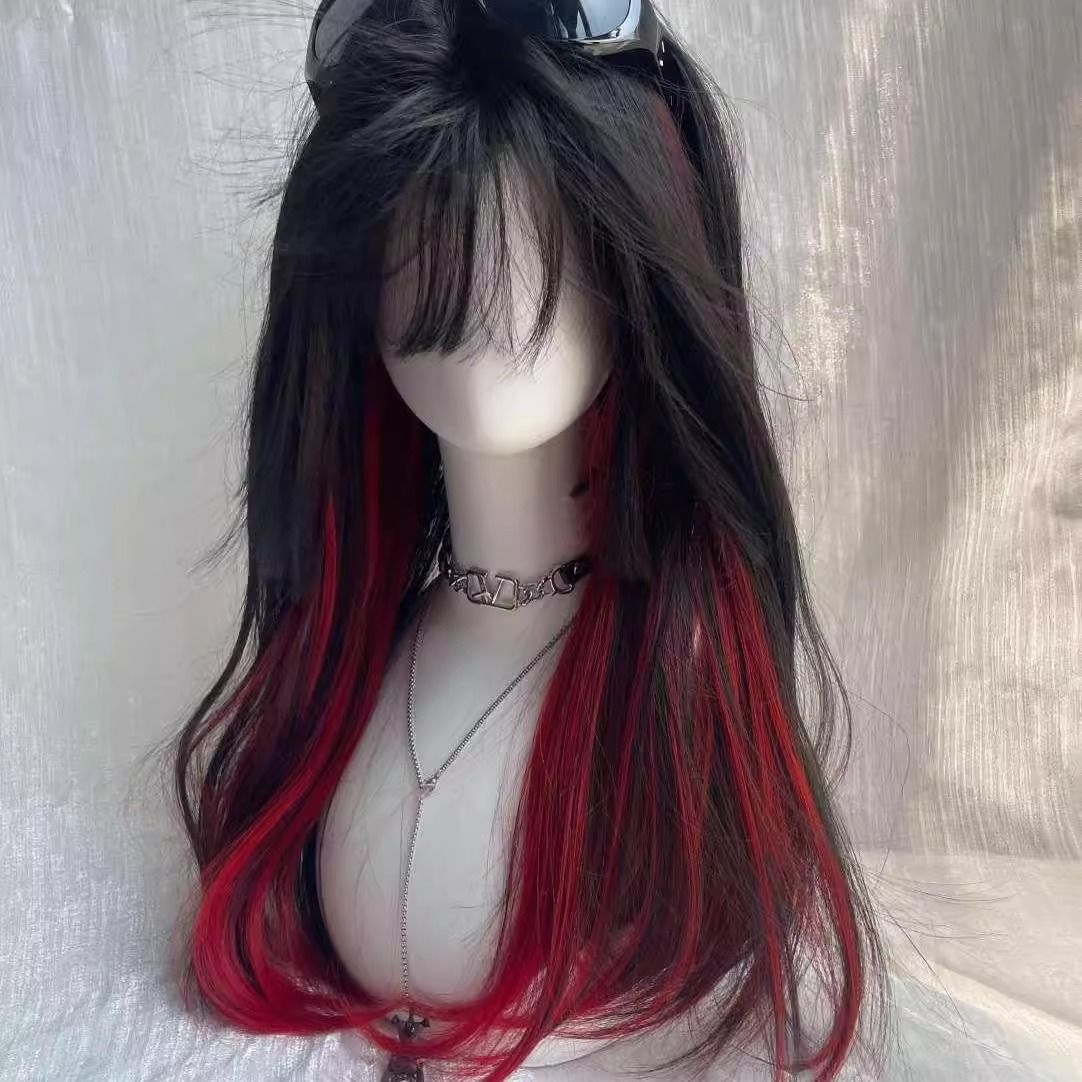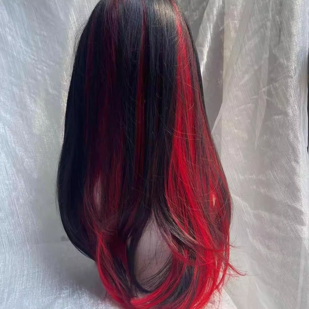 شعر مستعار من ألياف الحرير طويل مميزة باللونين الأسود والأحمر للنساء