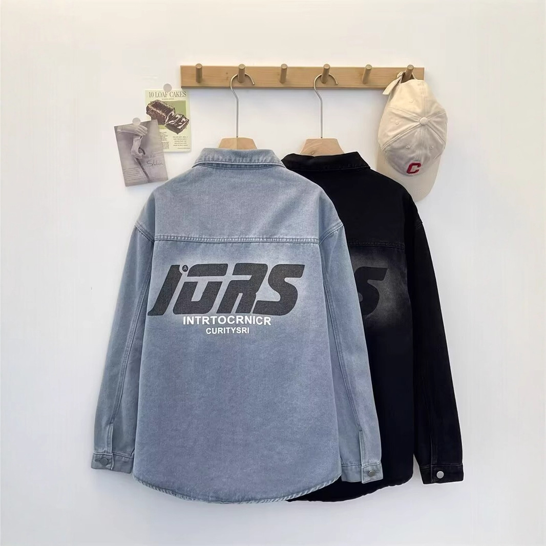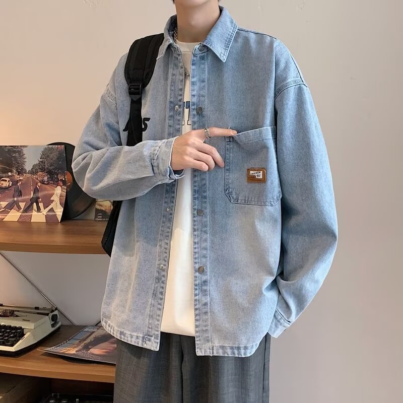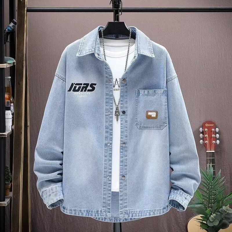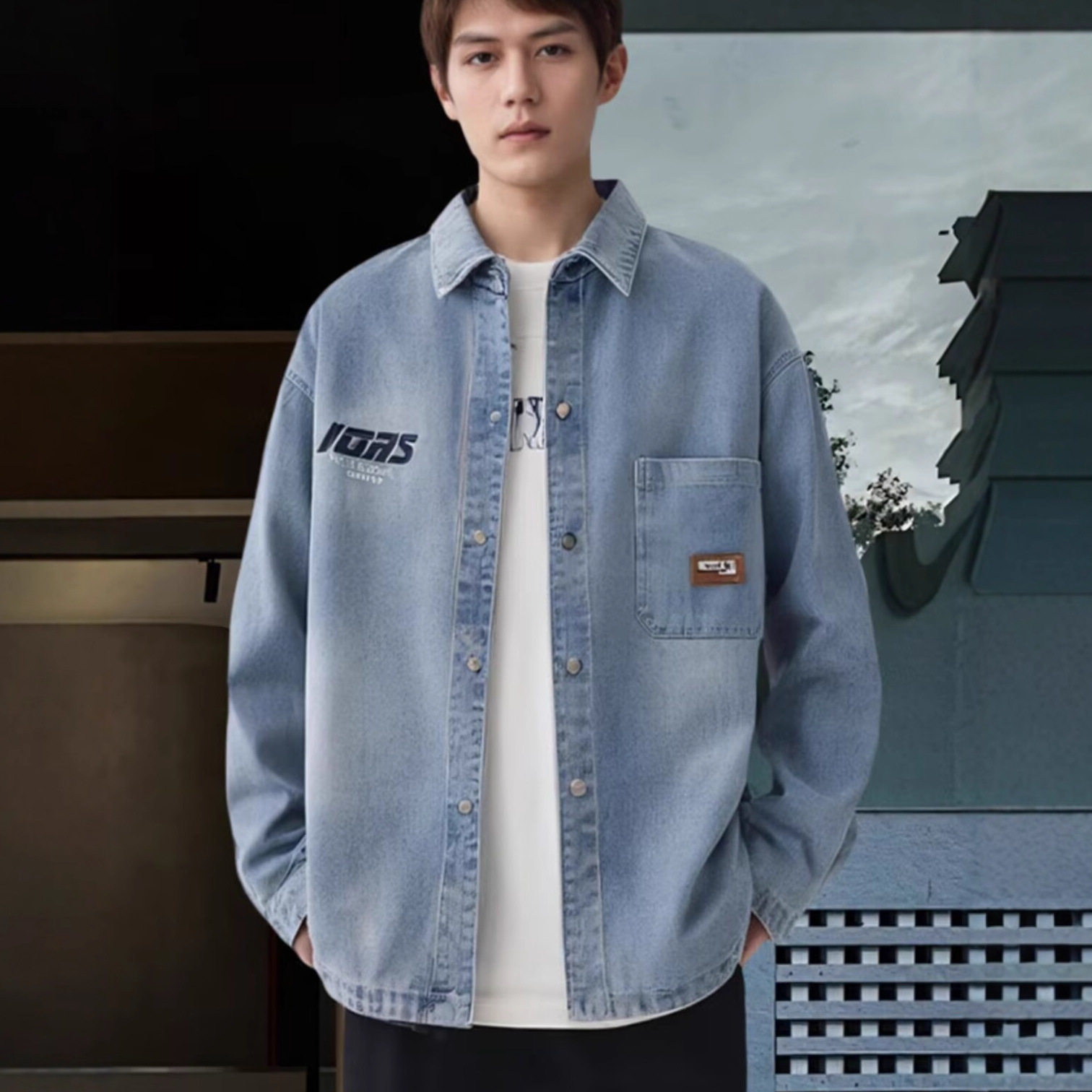 جاكت جينز فضفاض بأكمام وأزرار أمامية وياقة مقلوبة للرجال