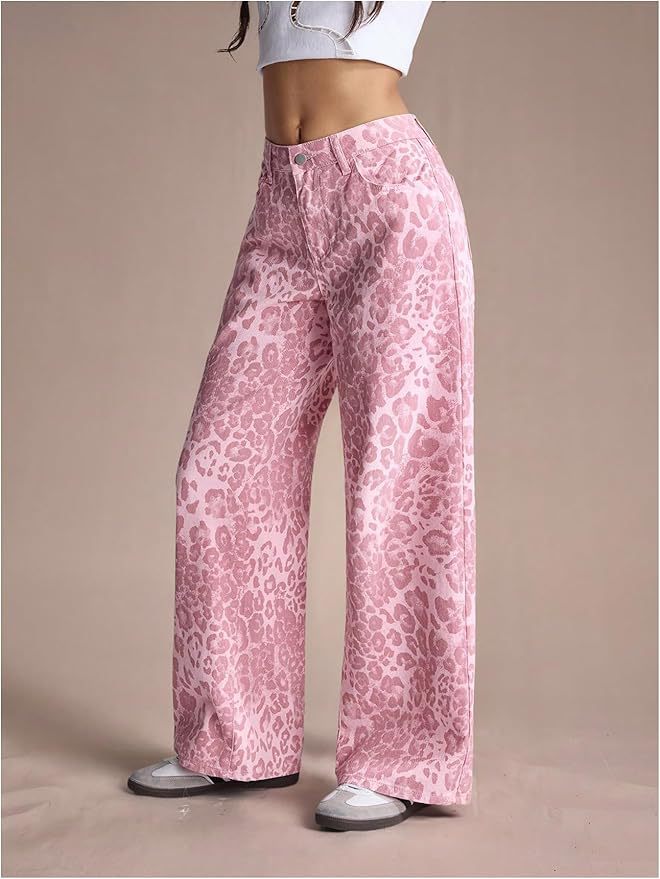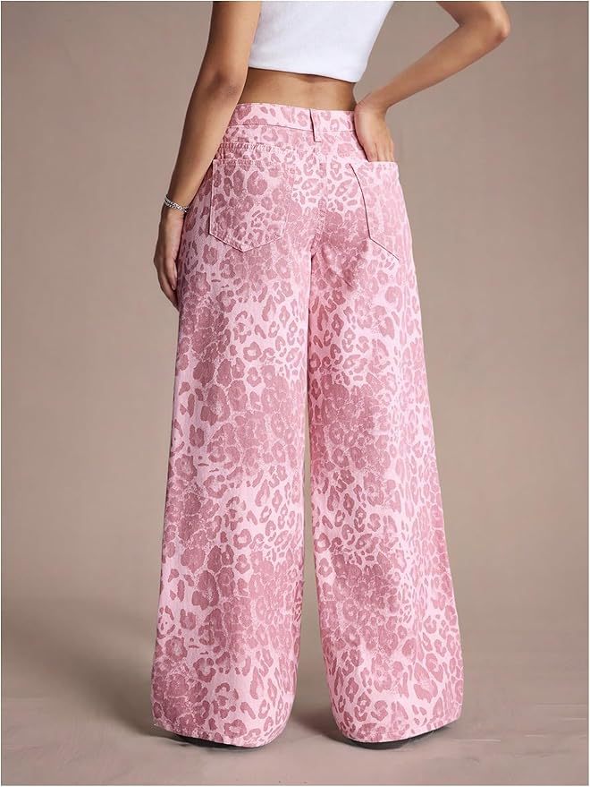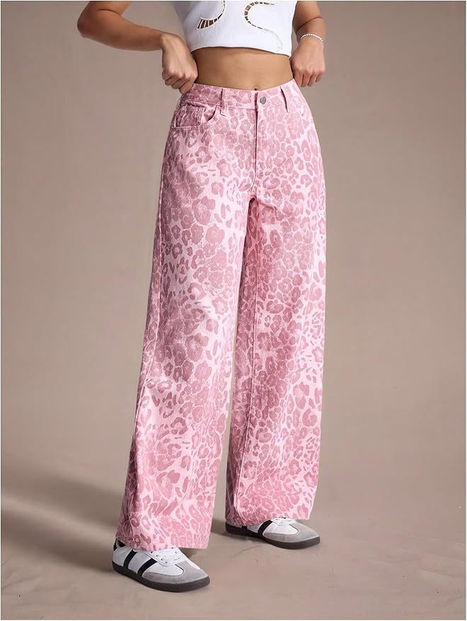 بنطلون جينز بنقشة جلد النمر باللون الوردي الدوباميني للنساء
