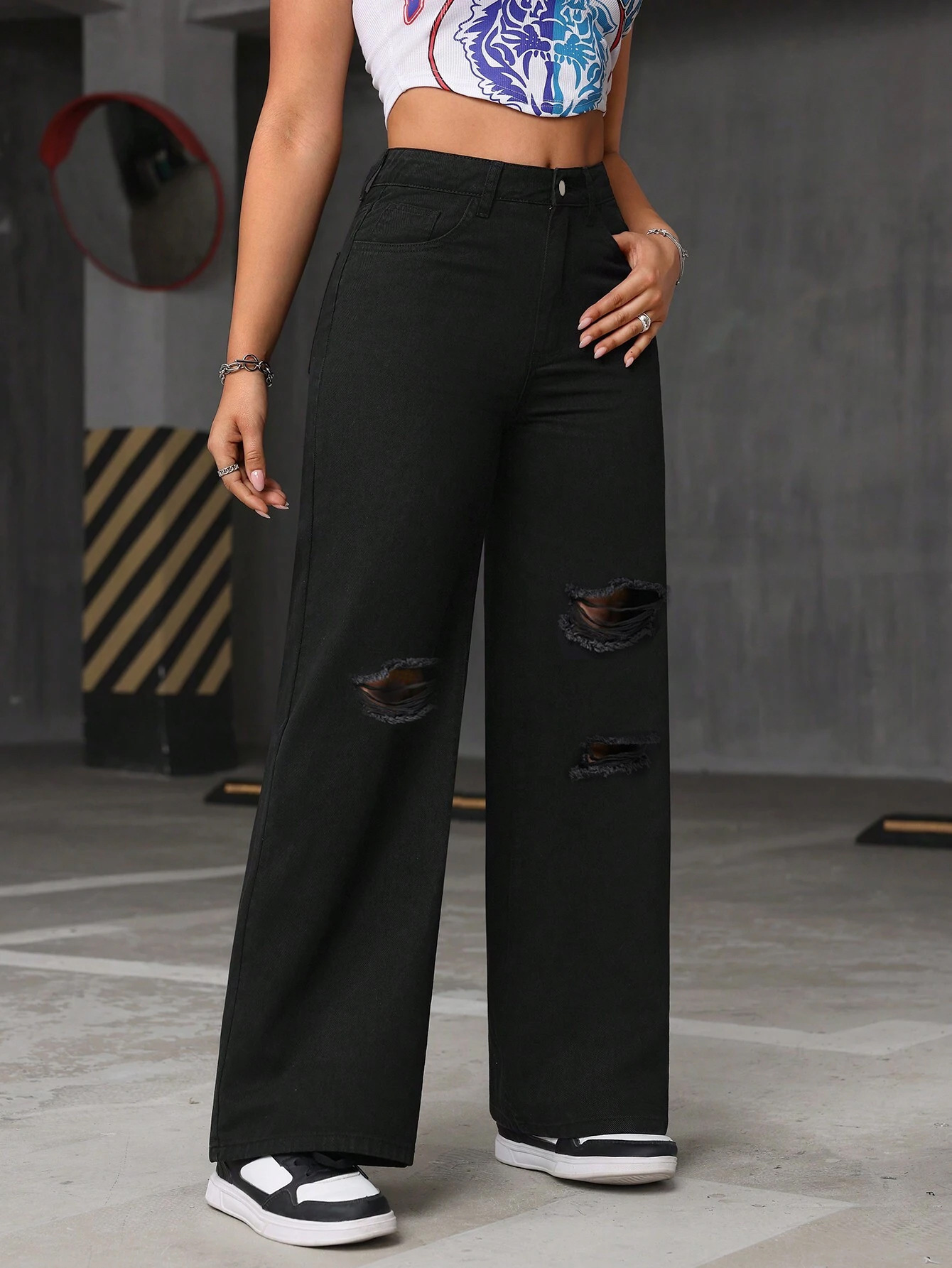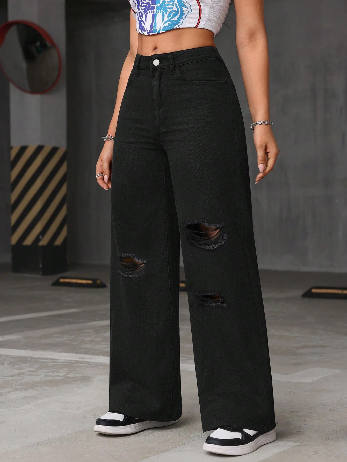 بنطلون جينز قطني واسع الساقين ممزق ومغسول بخصر عالٍ للسيدات