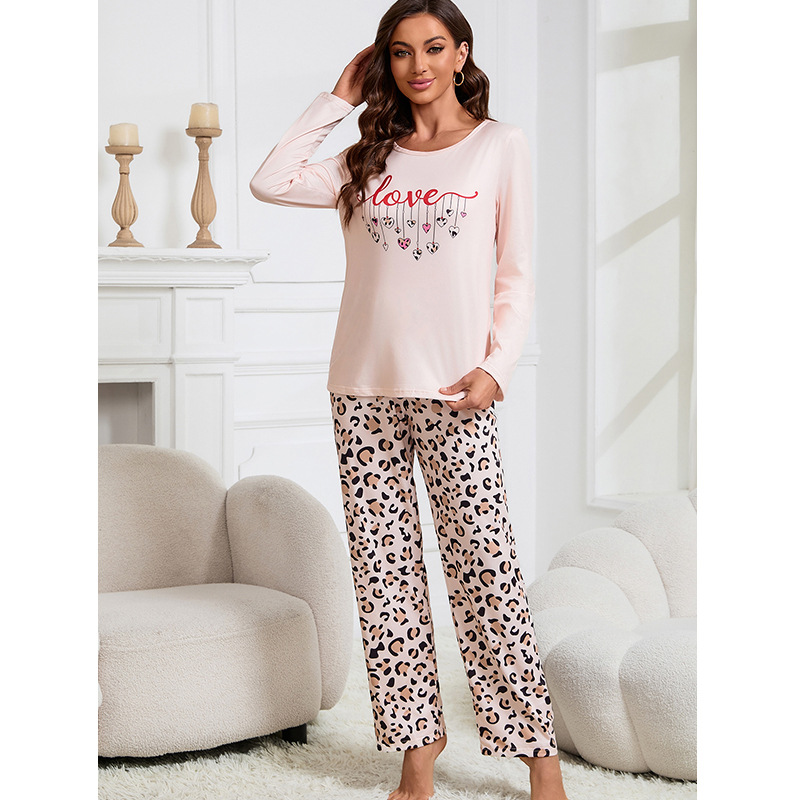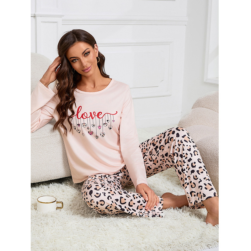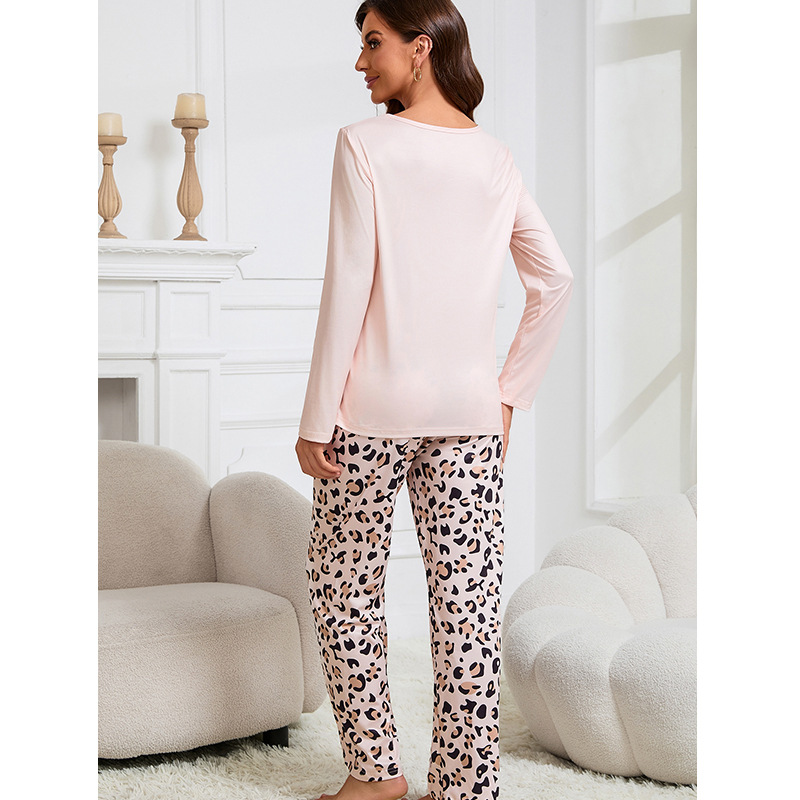 بيجامات رقيقة وذات رقبة مستديرة وطبعة جلد النمر بأكمام طويلة وبنطال طويل للنساء