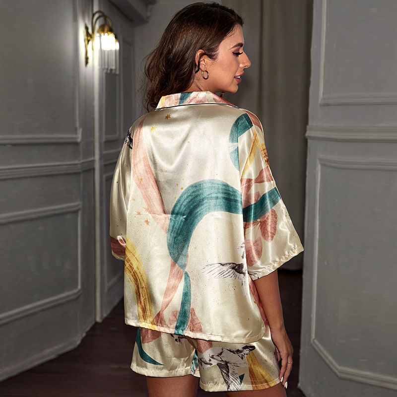 بيجامة منقوشة صيفية خفيفة من الحرير للسيدات