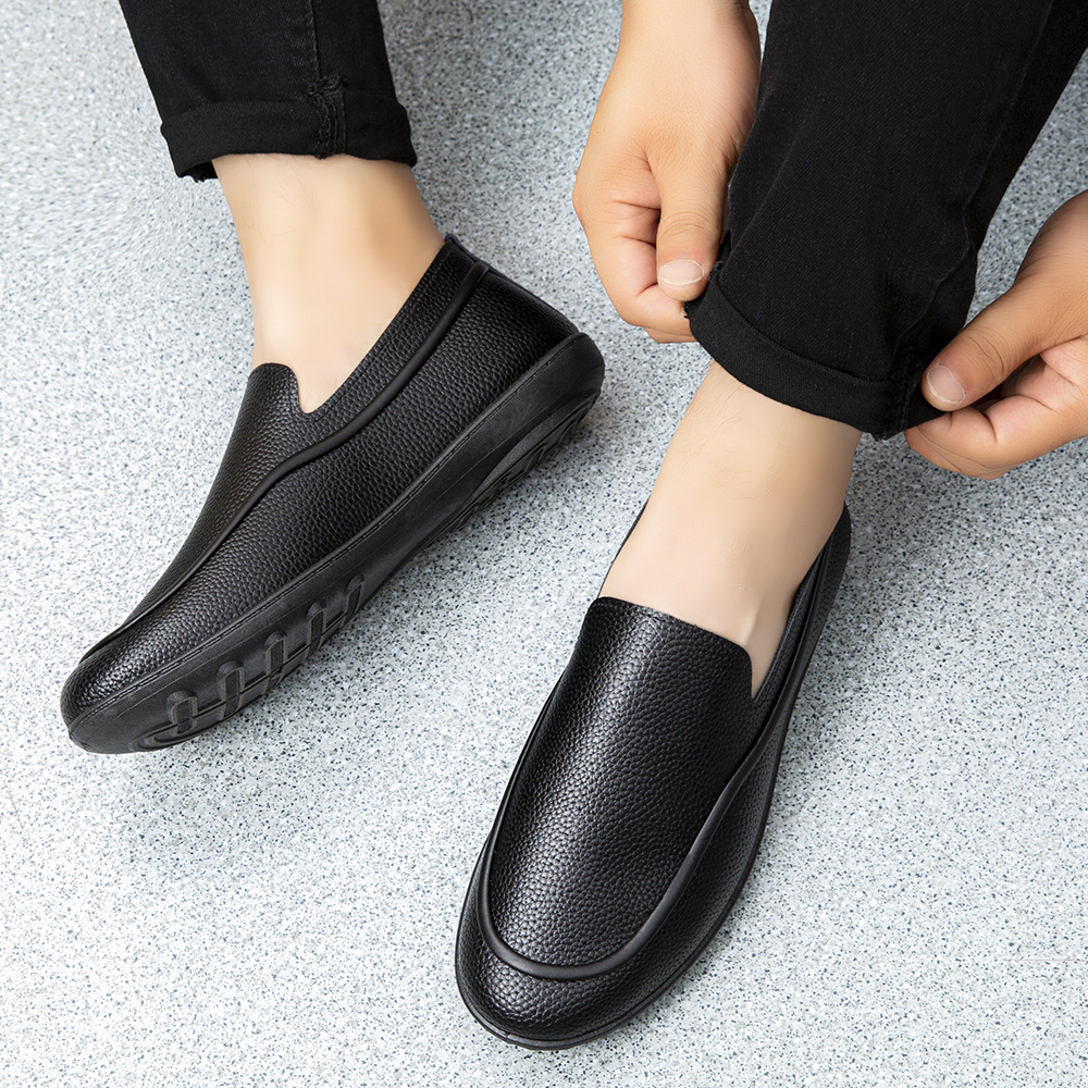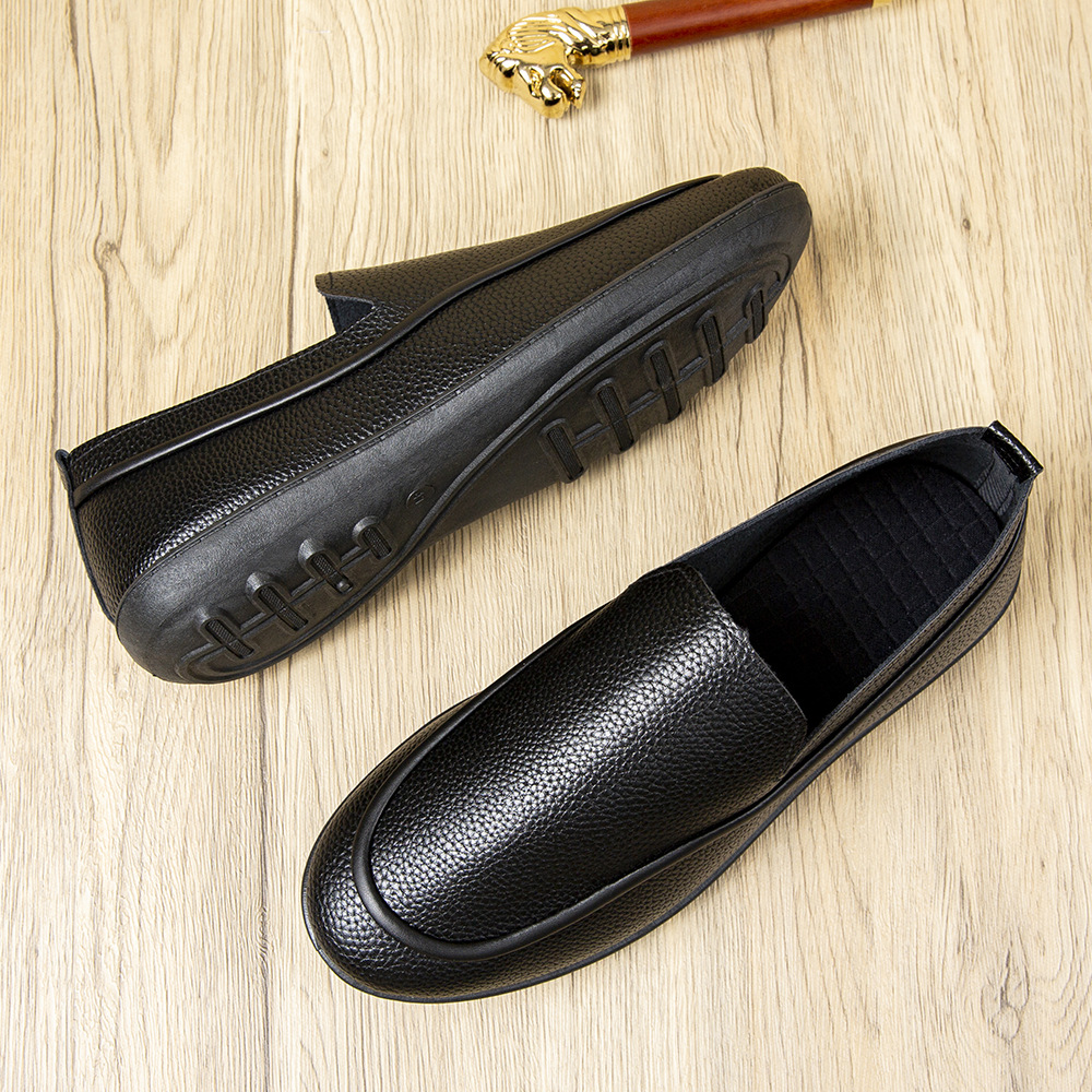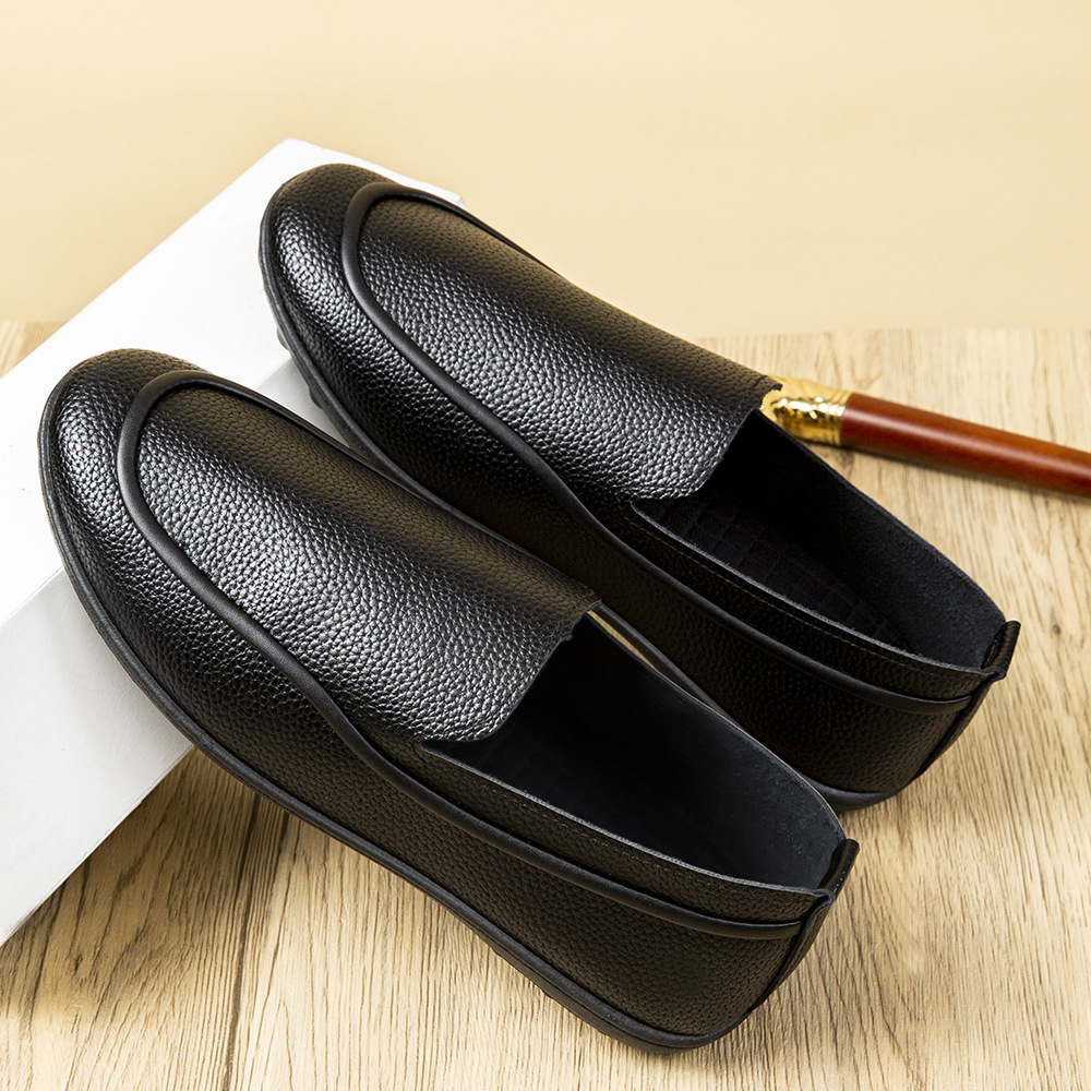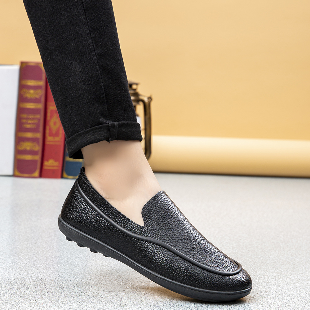 حذاء جلدي أسود مسطح وبرأس مستدير للرجال
