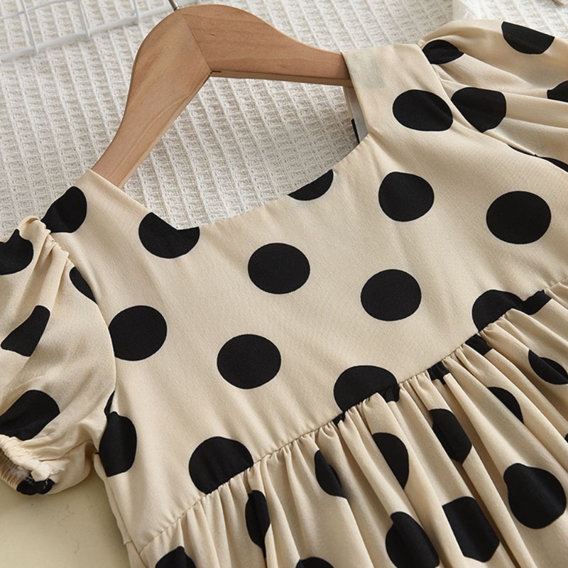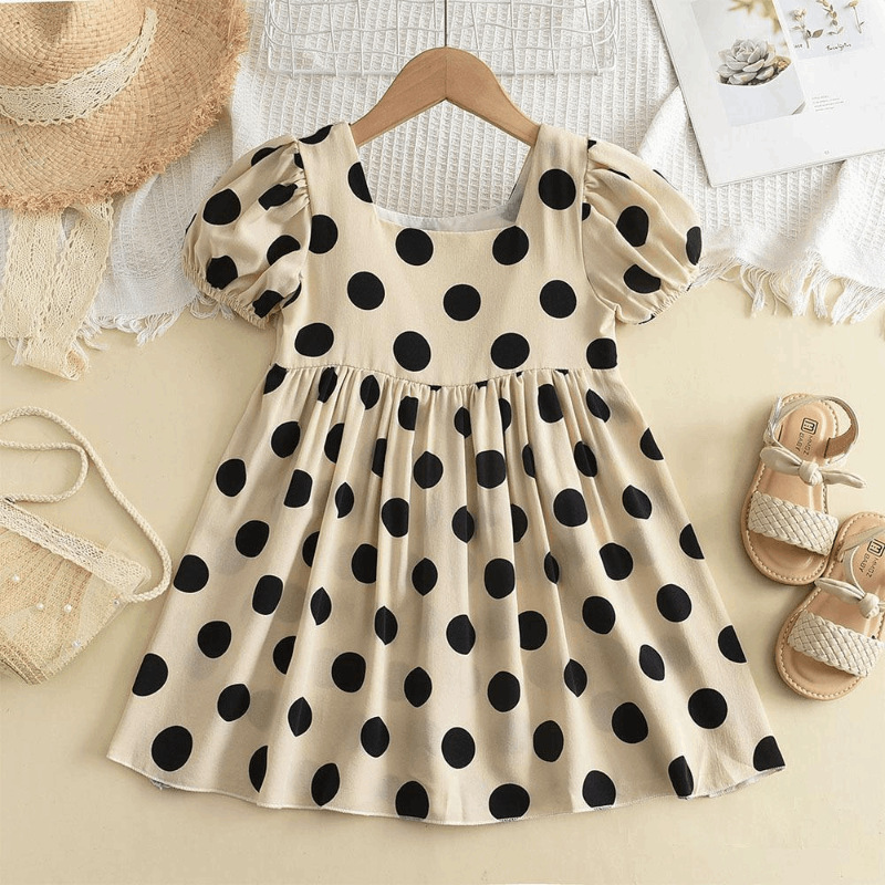 فستان صيفي قصير ومنقط بياقة مربعة وأكمام قصيرة للفتيات