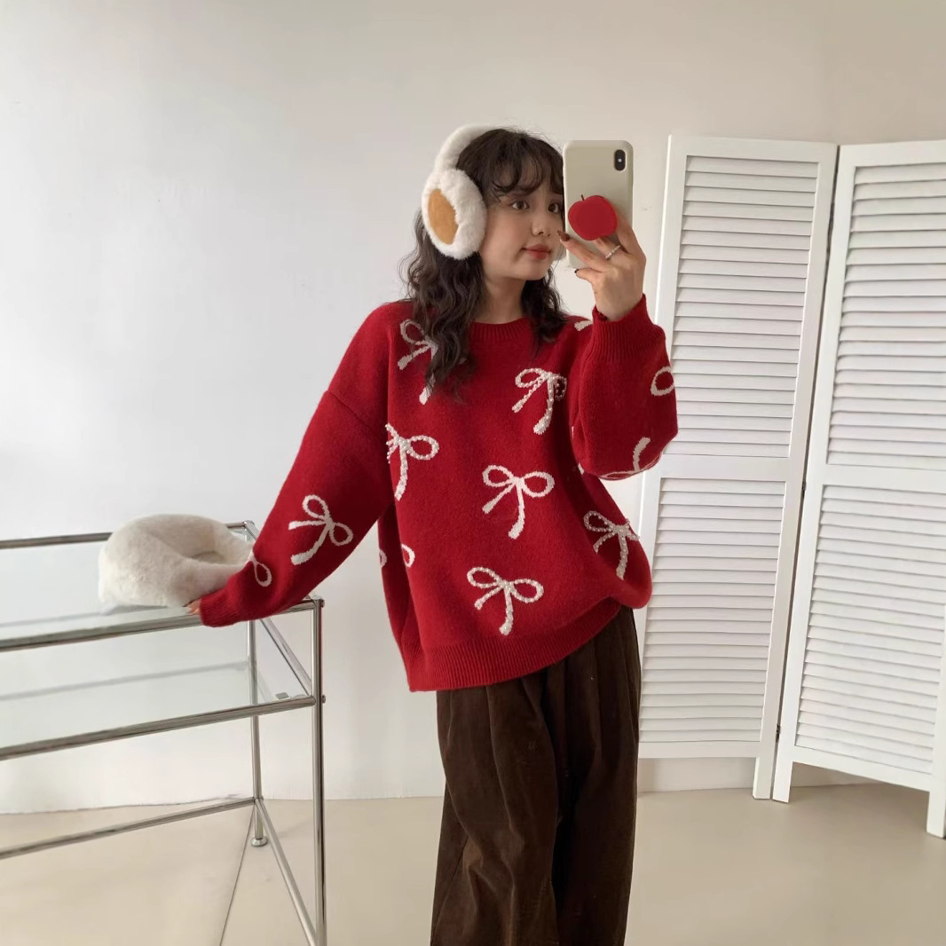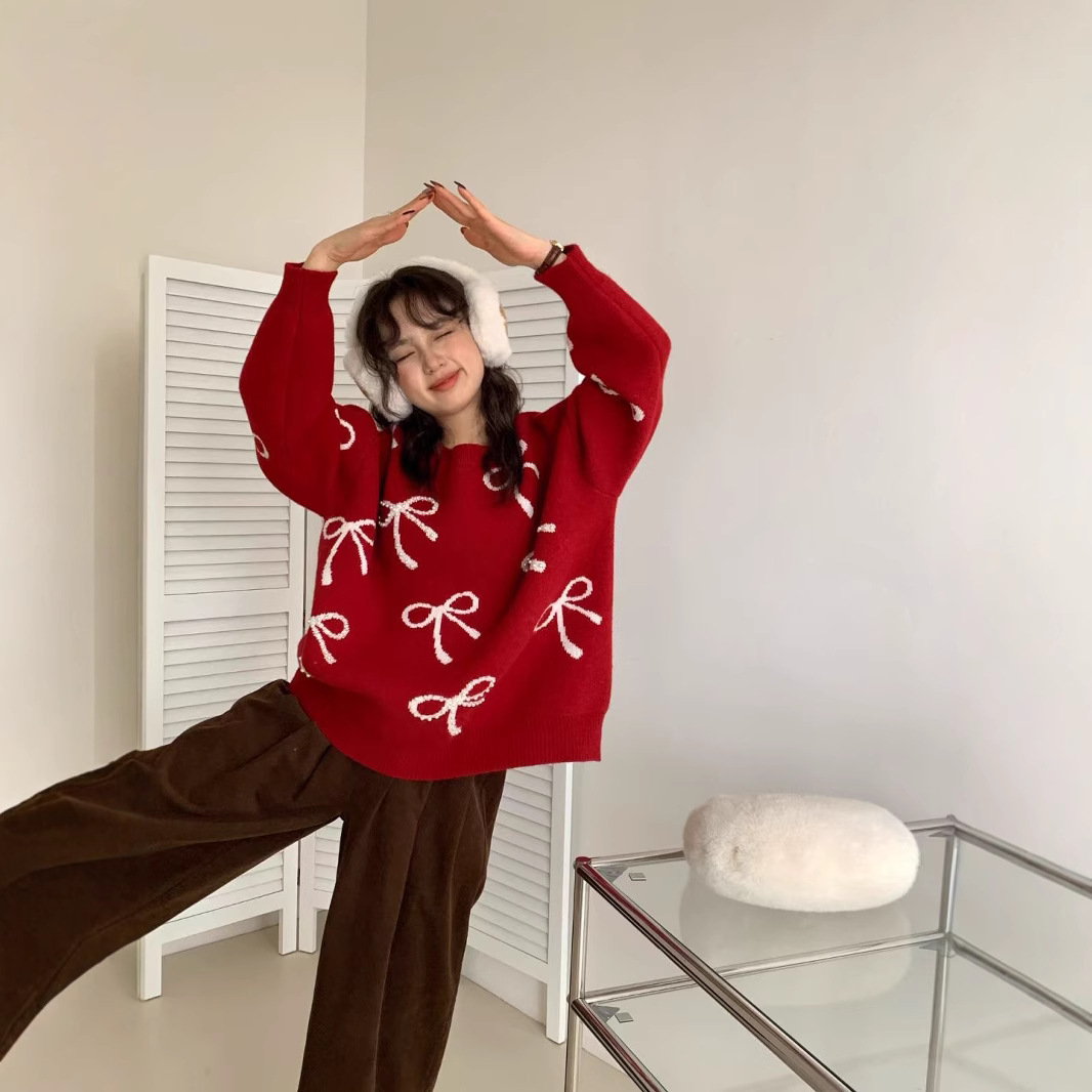 كنزة صوفية منقوشة بفيونكات ومطرزة بلؤلؤ للنساء