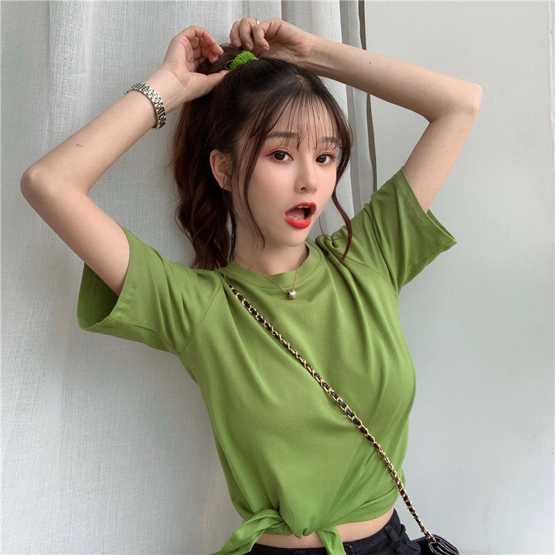 تيشيرت صيفي بخصر عالٍ وأكمام قصيرة بلون موحد للسيدات