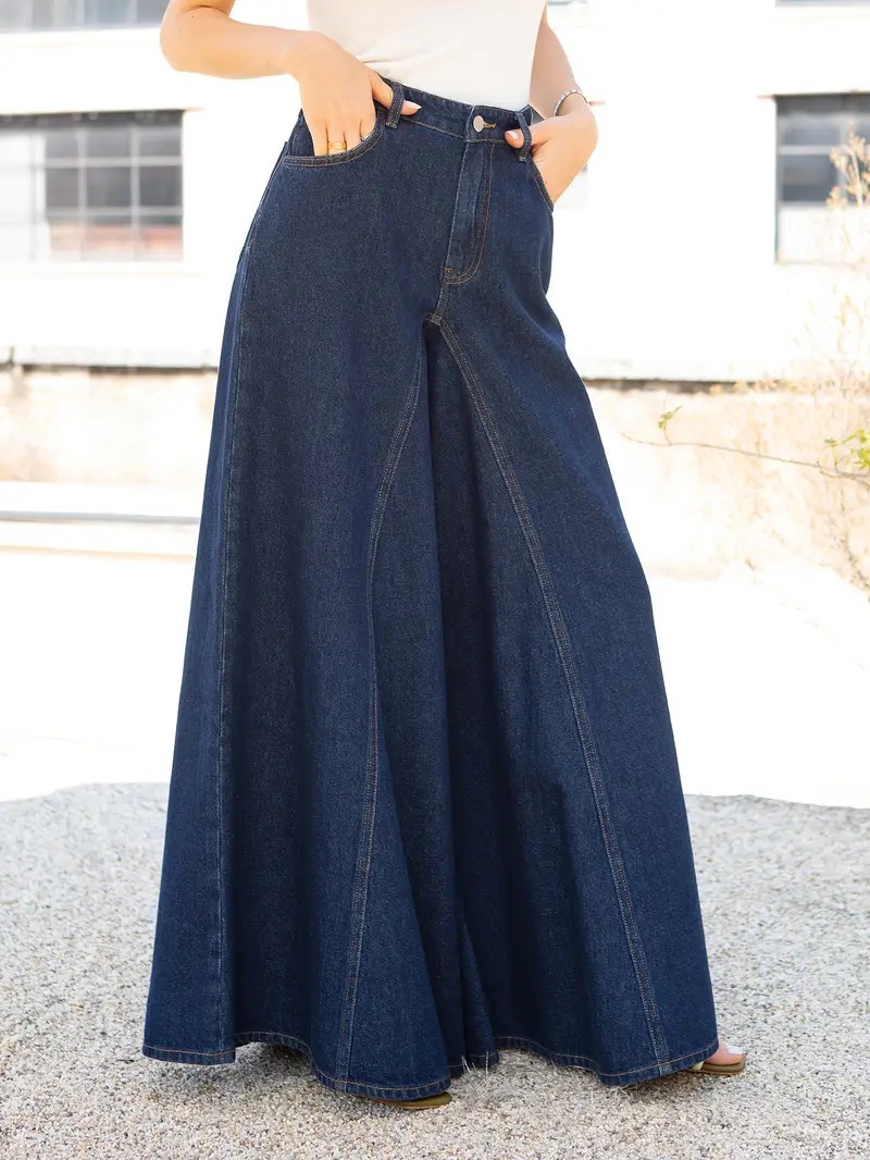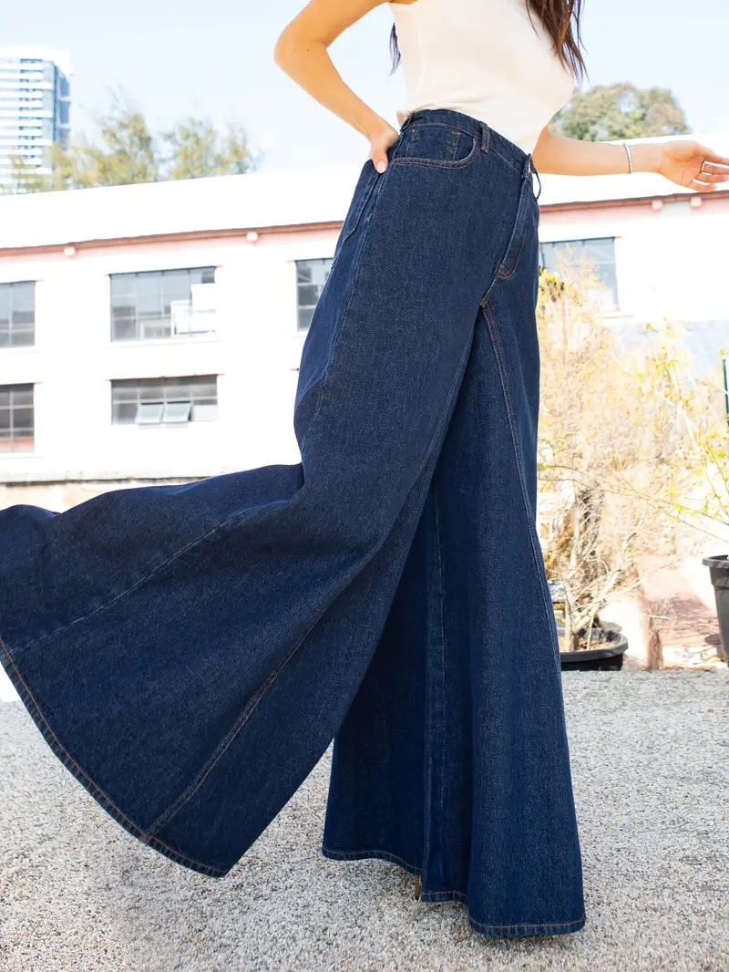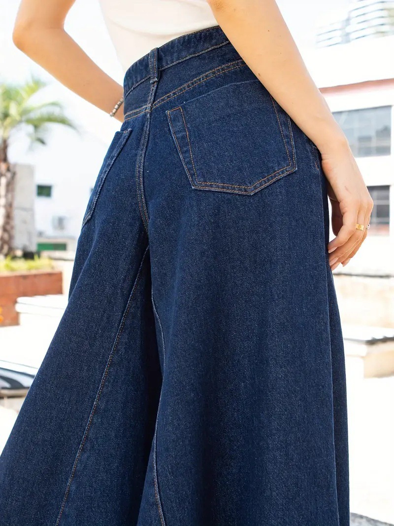 جينز ذو تصميم عصري وأنيق وبسيط واسع الساقين مصنوع من قماش الدنيم المطاطي للسيدات