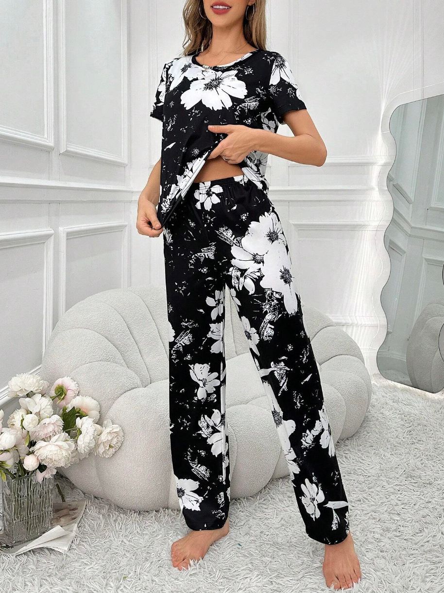 بيجامة صيفية منقوشة بأكمام قصيرة وياقة دائرية وبنطال طويل للسيدات