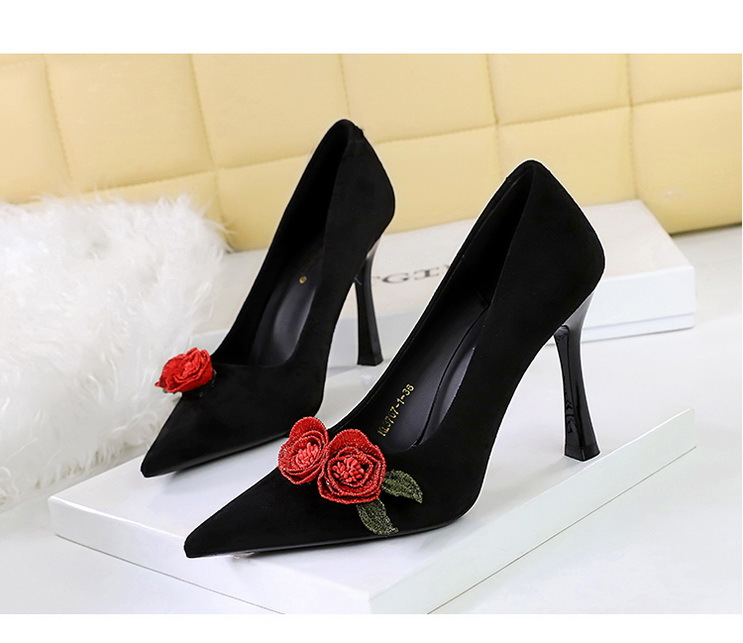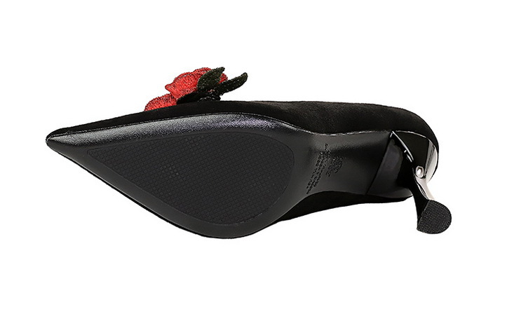 حذاء نسائي أسود من المخمل الناعم مطرز بالورد الأحمر راقي وانيق