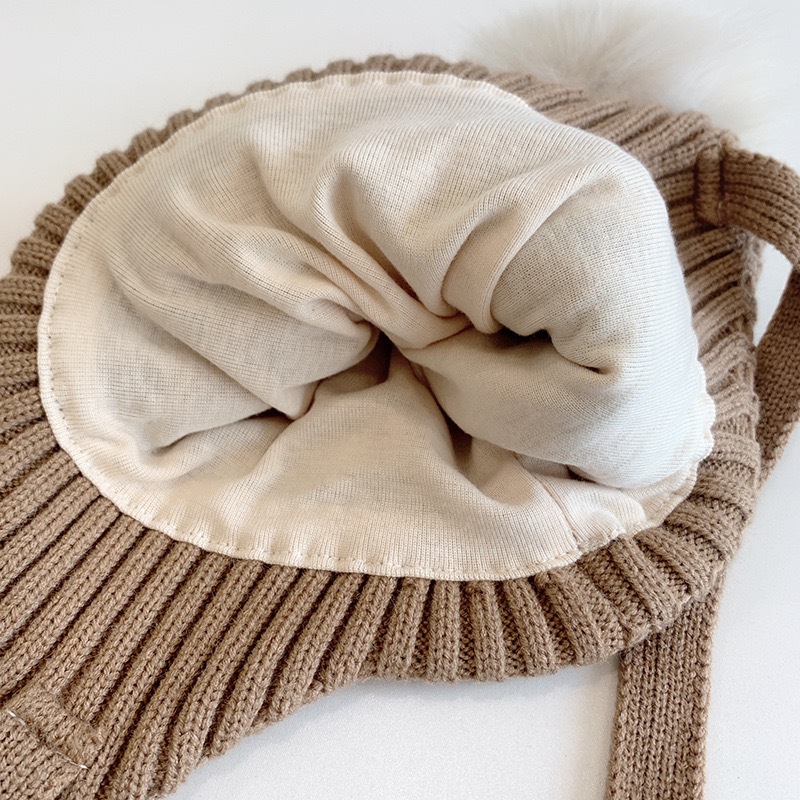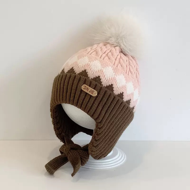 قبعة أطفال مخملية دافئة برباط على الرقبة، قبعة كاجوال بالوان متباينه لفصل الشتاء