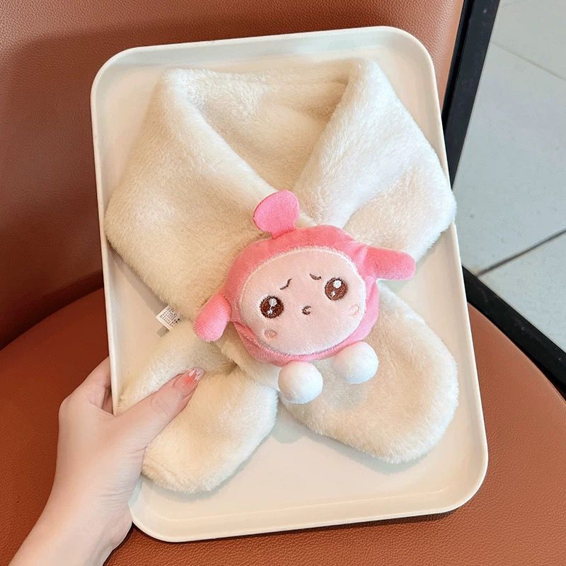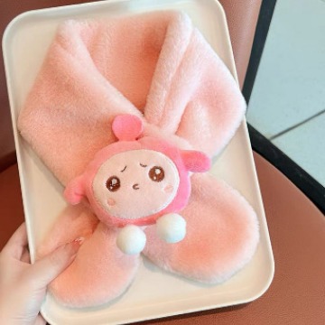 وشاح رقبة كرتوني بالوان ساده مع دمية لطيفة، وشاح للأطفال من الفرو المقلد بالوان ساده
