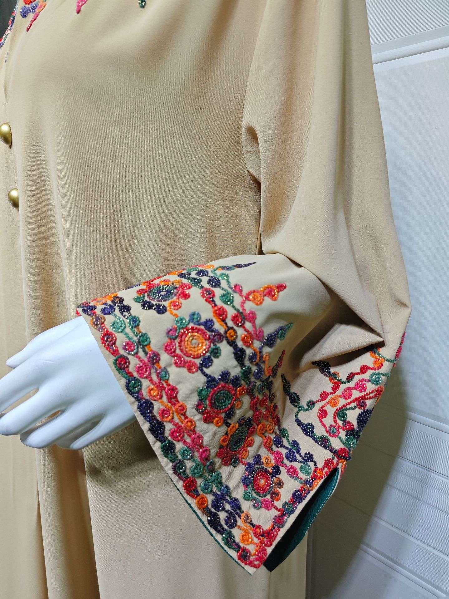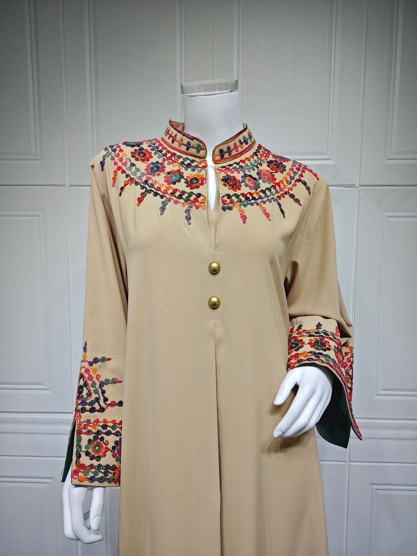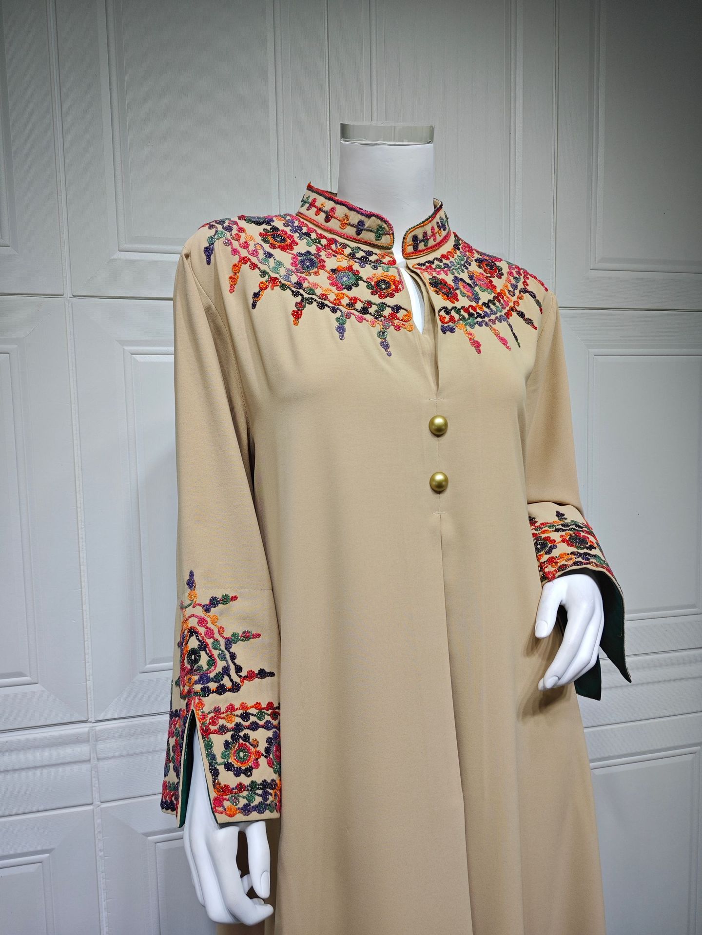 جلابية نسائي مطرزه الرقبة والكتفين، جلابية عصريه موضه جديده بزرار ذهبي على الصدر