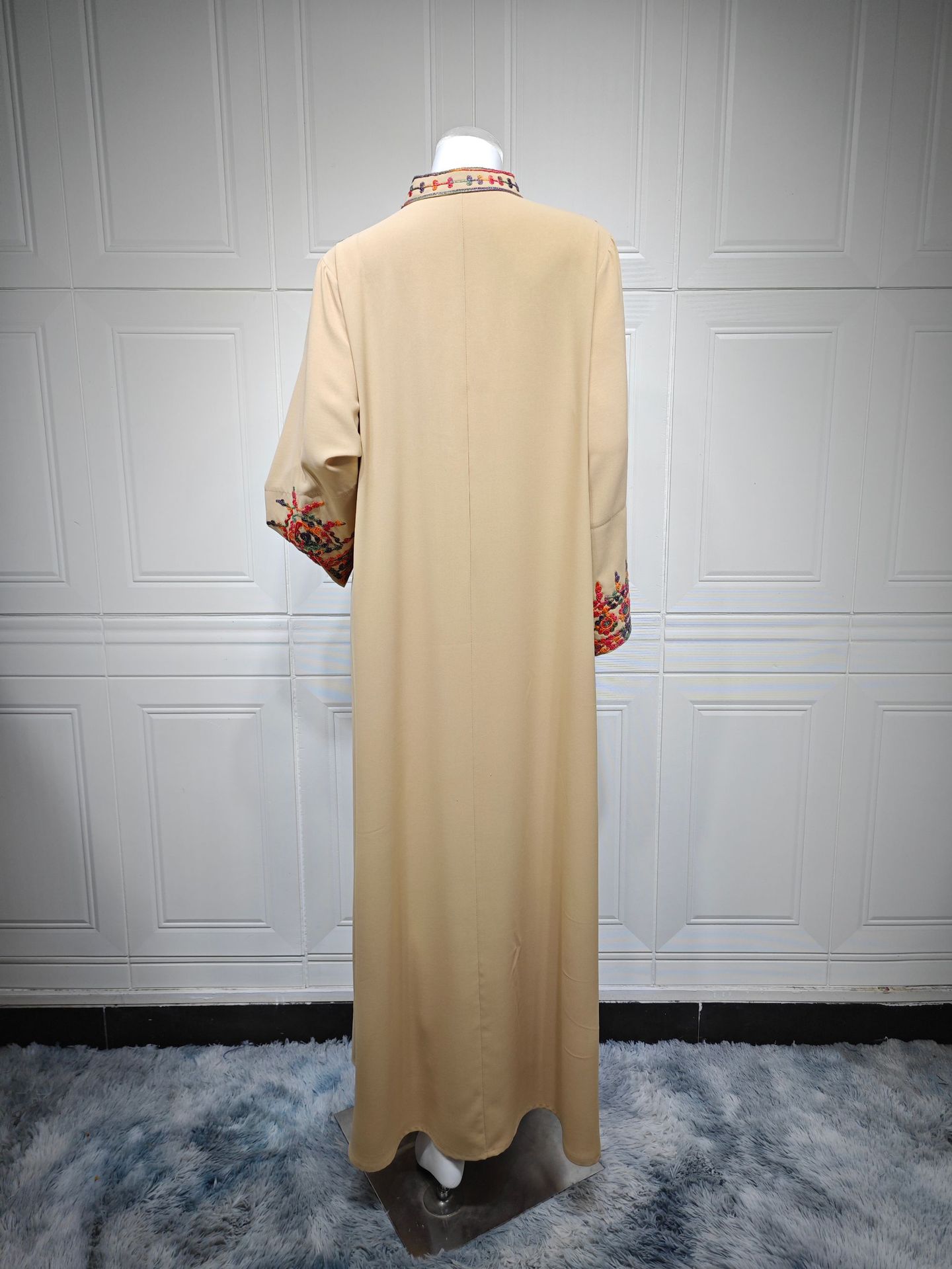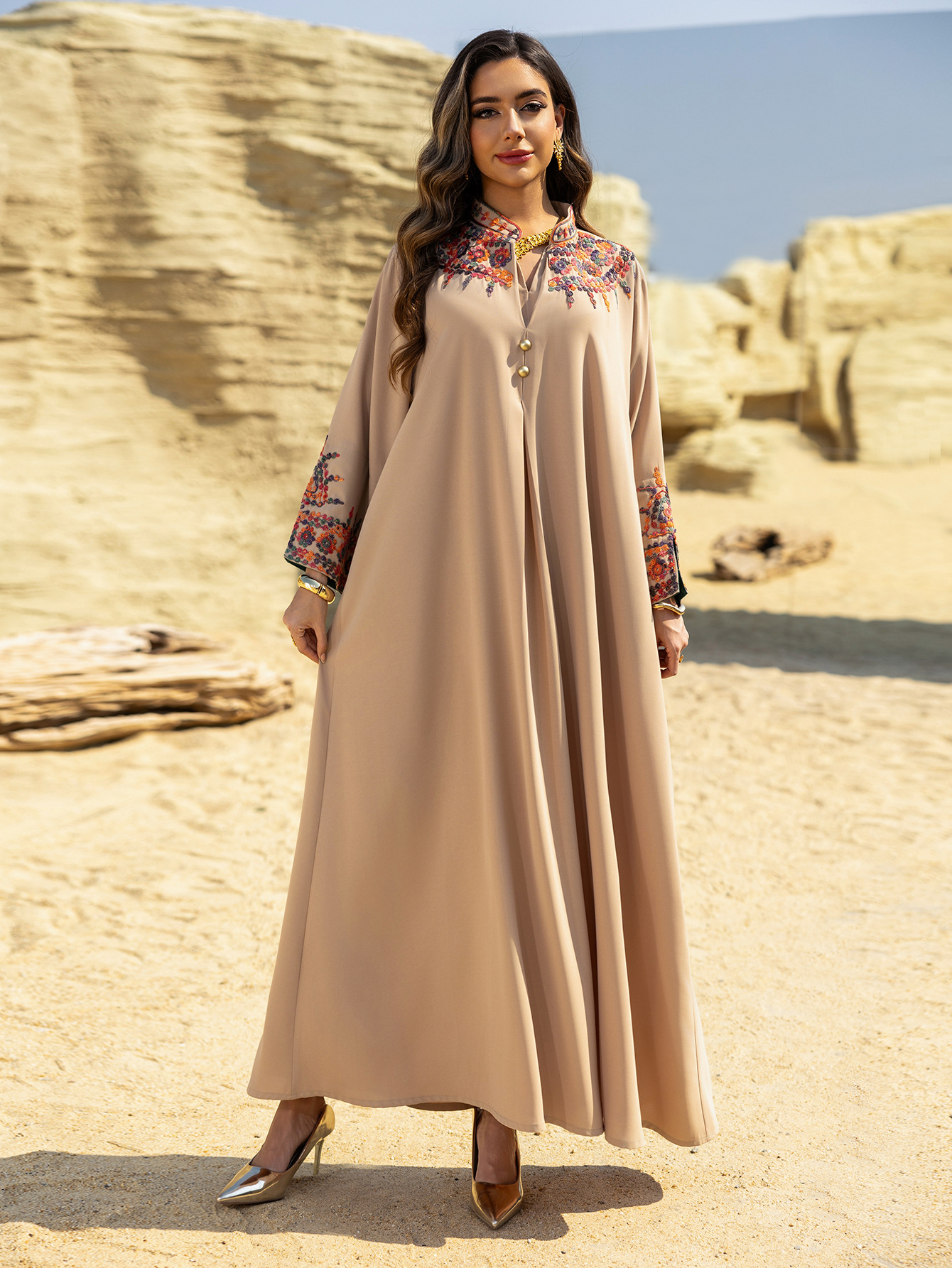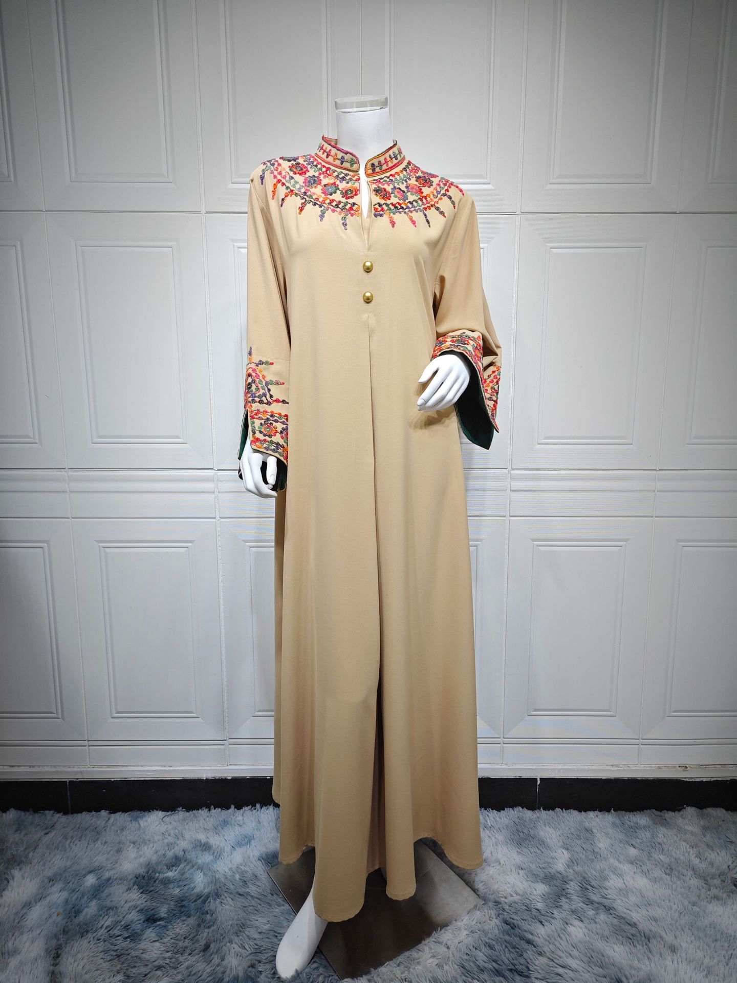 جلابية نسائي مطرزه الرقبة والكتفين، جلابية عصريه موضه جديده بزرار ذهبي على الصدر