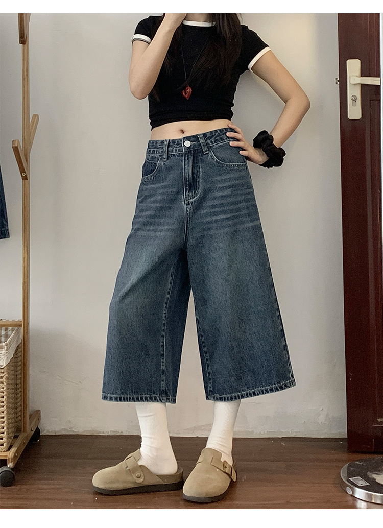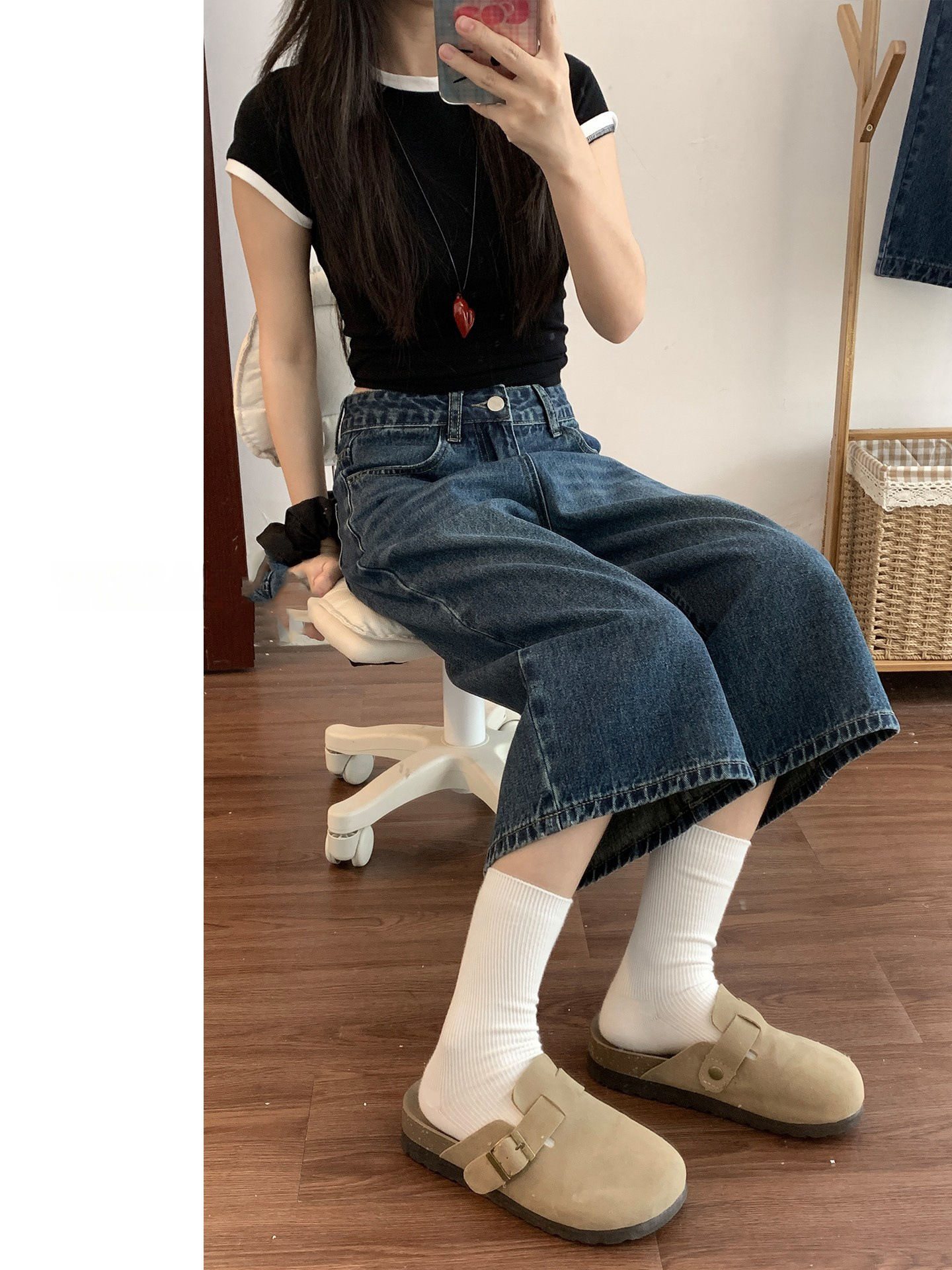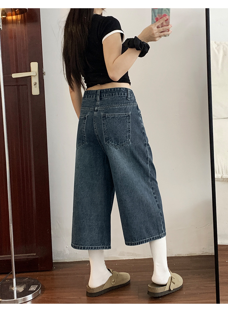 بنطلون جينز نسائي صيفي واسع الساق من قماش الدنيم