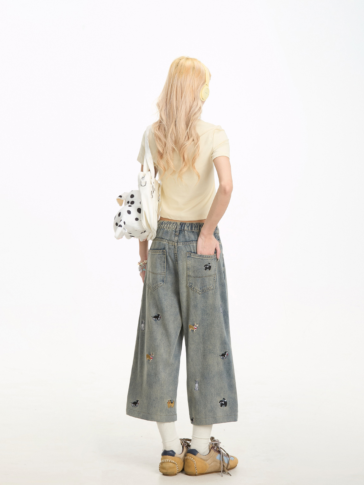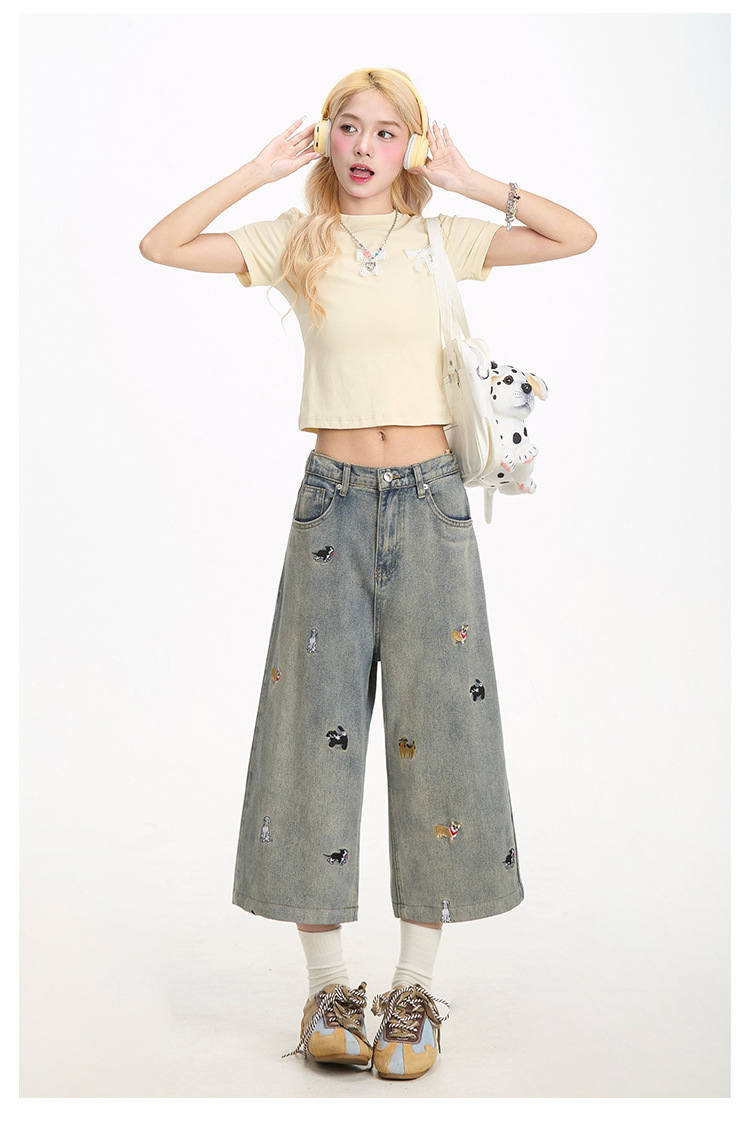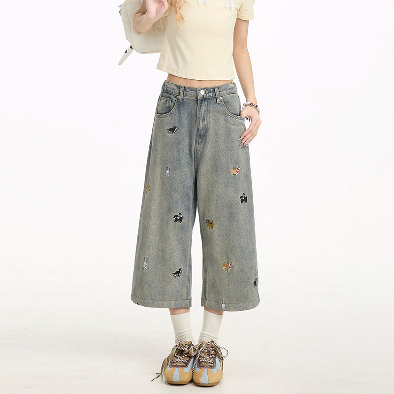 جينز نسائي ميدي مطرز فضفاض، مستقيم، واسع الساق